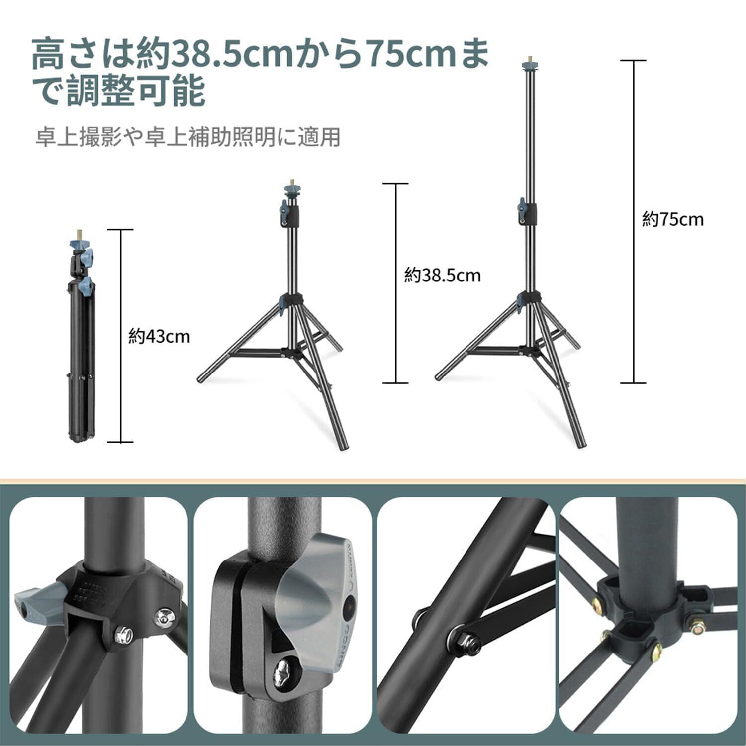【省スペースの撮影スタンドキット】68×75㎝の背景スタンドと68×130㎝の背景布キット、コンパクト設計で卓上スペースを節約します。いつでもどこでも素早くセッティングして撮影作業をスタートすることができます。オモチャやジュエリー、腕時計、香水、化粧品、財布、アクセサリーなどの小物撮影に適用します。ライトスタンドの高さは38.5cmから75cmまで調整可能で、クロスバーの幅は約67.5cmです。撮影背景スタンドだけではなく、バナースタンドやポスタースタンド等にも適用します。