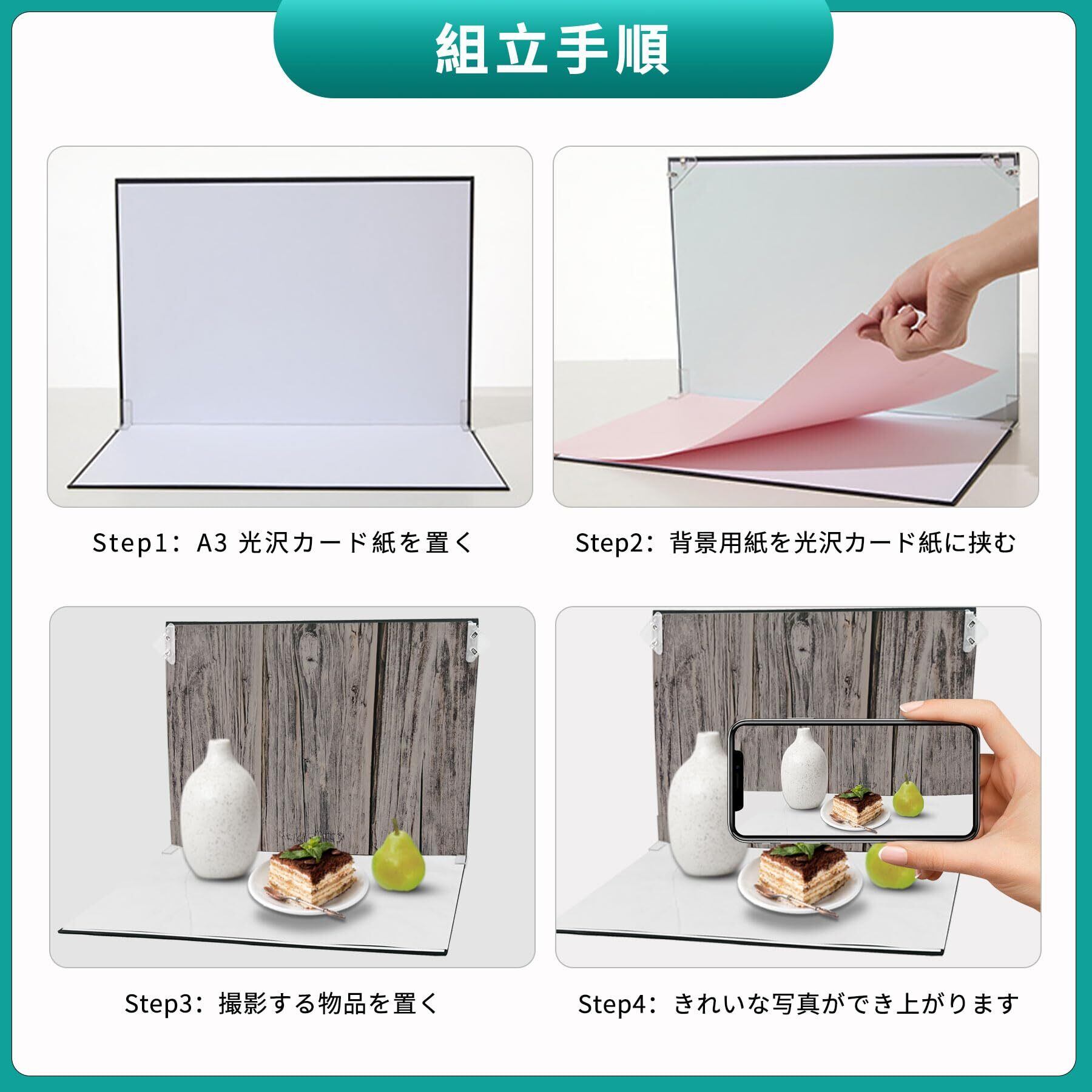 ■【A3サイズで使いやすい!】各背景シートはA3サイズ(約297 x 420mm)で、どんなシーンでも使いやすさ抜群です。小型の撮影ボックスでの使用や、日常の撮影シーンに最適なサイズ感が特徴です。