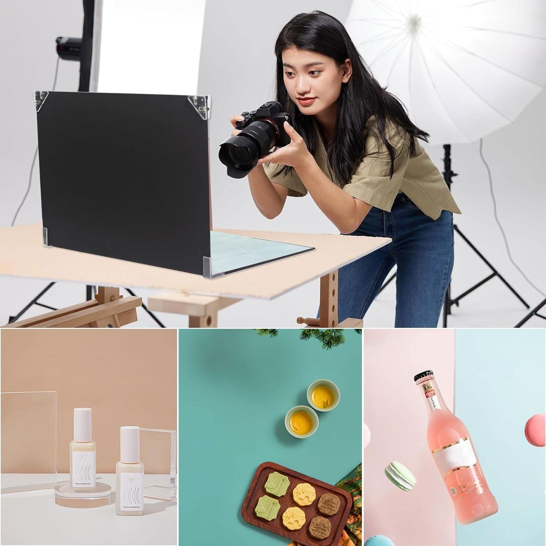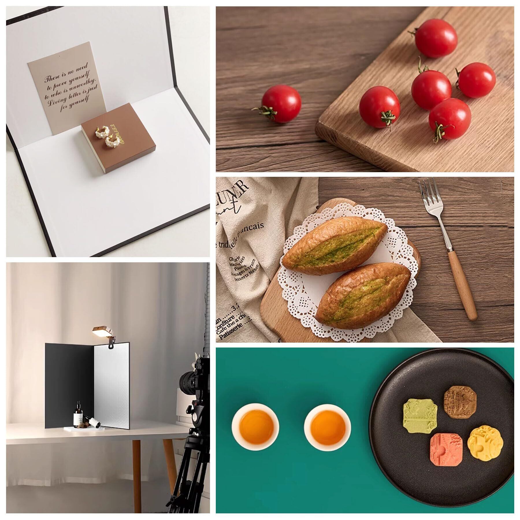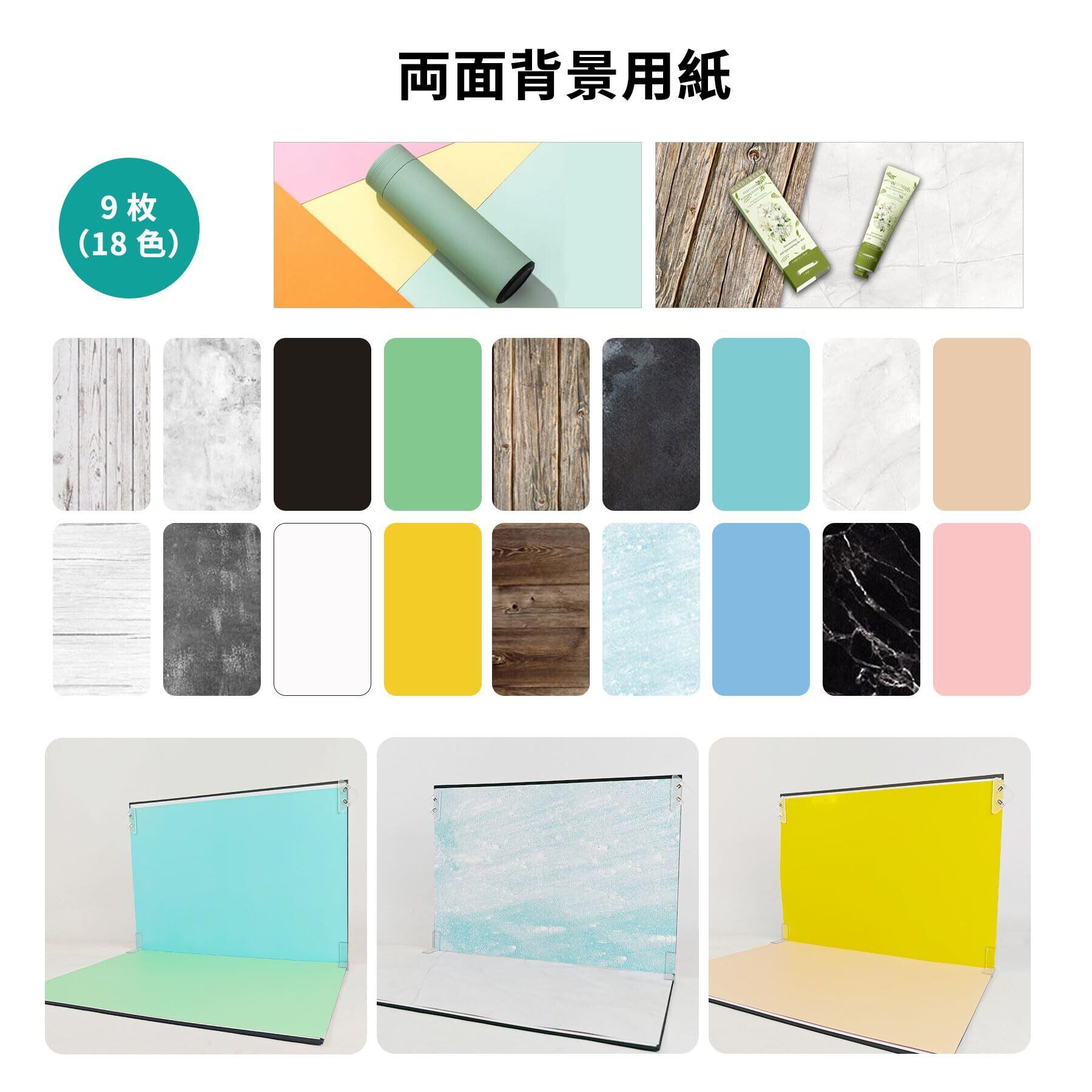 【充実したパッケージ内容】このセットには、両面使用可能な撮影用背景紙が9枚、反射板が1枚、クリップが2個、L字クリップが2個、そして専用のハンドバッグが付属しています。これらのアイテムが揃っていることで、あらゆる撮影シーンに柔軟に対応できます。例えば、反射板で光の調整を行い、クリップやL字クリップで背景紙を固定することができ、ハンドバッグに入れて持ち運ぶことも簡単です。