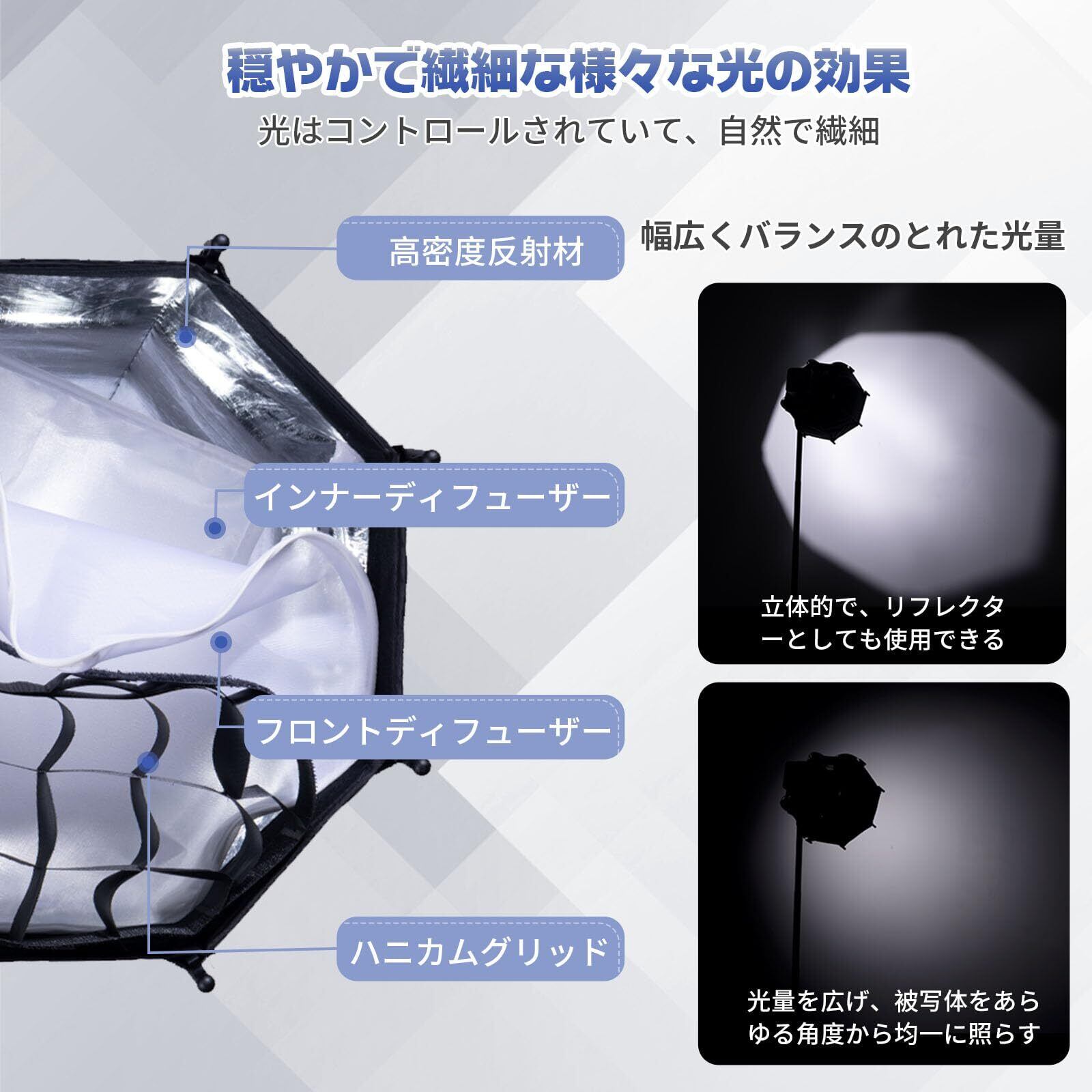 ■【豊富な付属品で多機能!】この商品には、ハニカムグリッド、ディフューザー、そして専用のバッグが付属しています。これにより、照明効果の調整ができ、よりクリエイティブな撮影が実現可能です。光の散乱を防ぎ、被写体のディテールを際立てるハニカムグリッドが特に便利です!