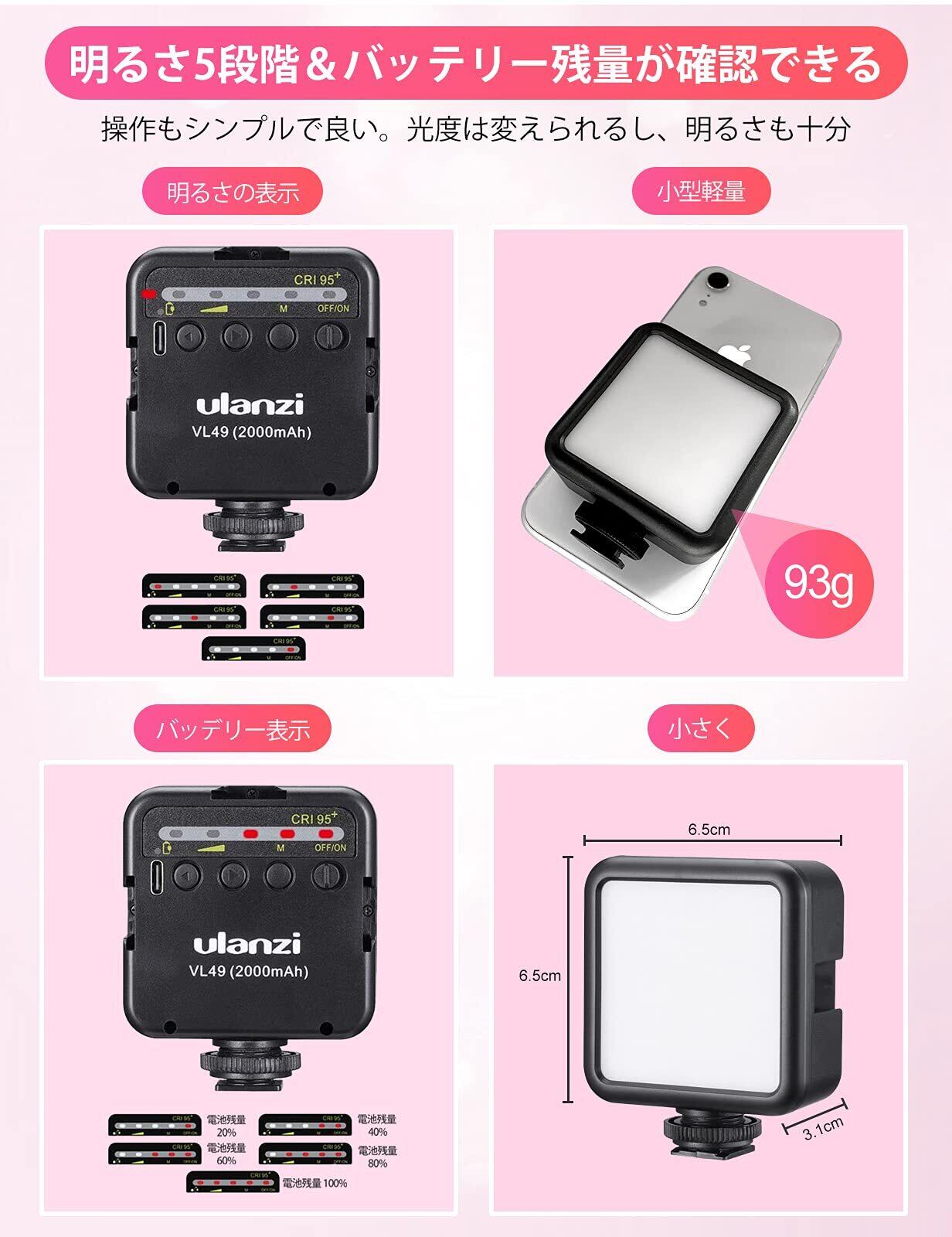 Ulanzi 49led 撮影用ライト usb ledビデオライト 小型 撮影 2000mAh 充電式 四角形 手持ち 動画撮影 人物 ホットシュー 超薄型 超高輝度 明るい白色光 5段調節 夜撮影 人物 ソニー ミラーレス zv-1 α6000 gopro hero9用 iPhone /Samsung 用 スマホ Canon Nikon Sony Zhiyun Smooth 4 DJI OSMO Mobile 3 Action osmo pocket用 カメラ ライト (モデル Ulanzi VL49 )