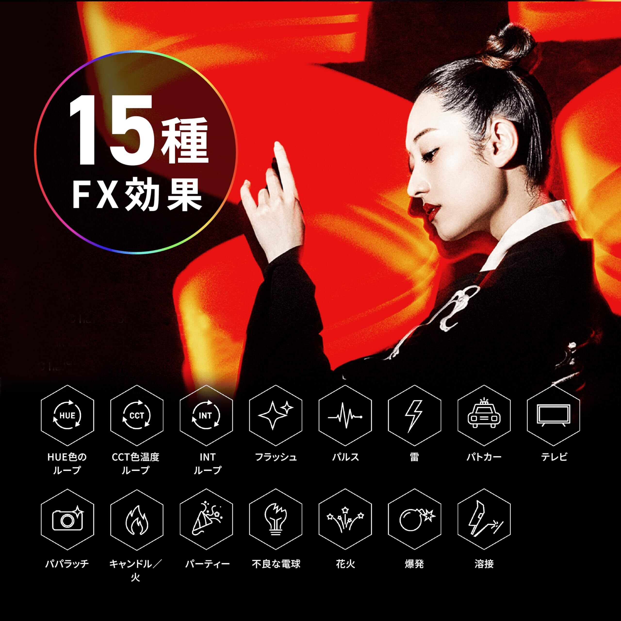 【豊富なカラーオプション・15種類FX効果】 NANLITE PavoTube II 6Cチューブ型撮影用ライトは、広範囲な色温度調整に加え、2700Kから7500Kまで対応します。また、最大36000色のRGBカラーオプションも利用できます。さらに、カメラフラッシュやパトカー、花火やテレビなど15種類の特殊効果モードが搭載されており、クリエイティブなシーン作成を実現できます。