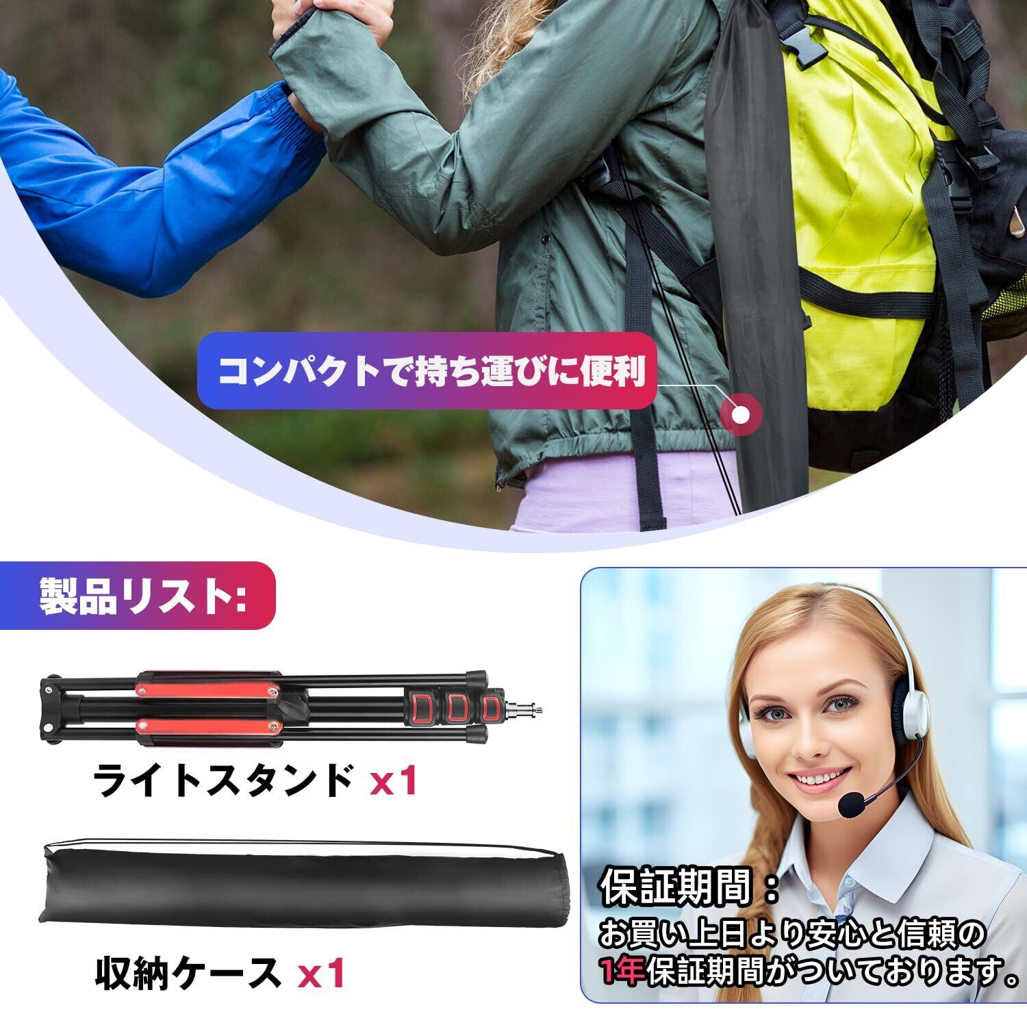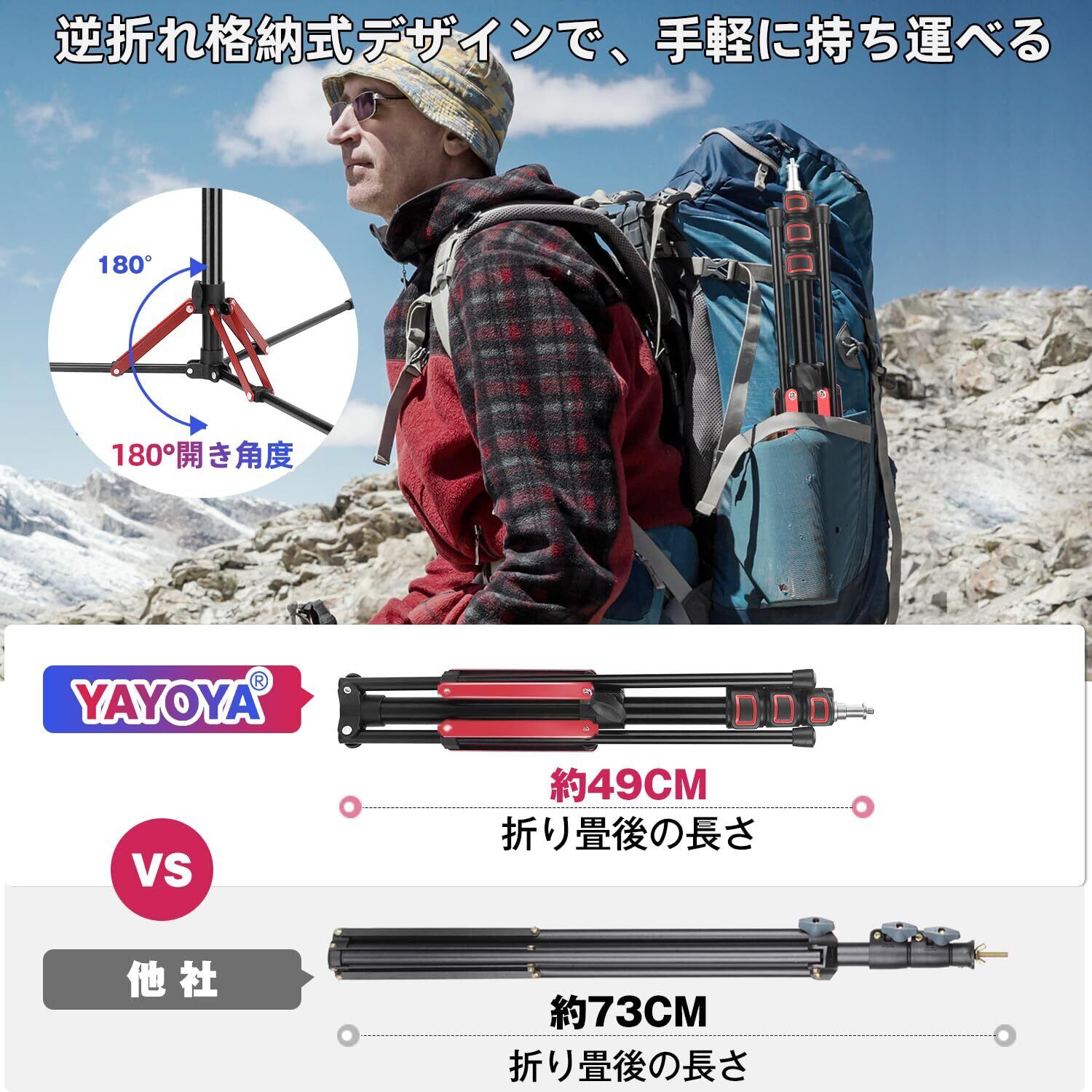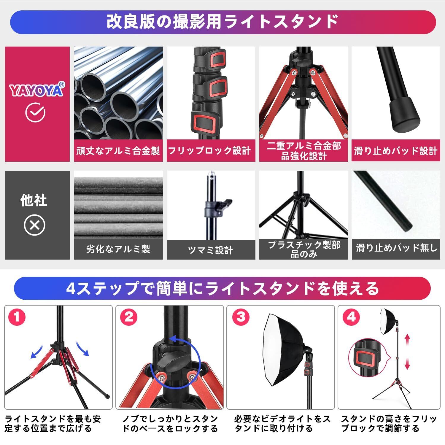【アップグレードのプロ 撮影用 ライトスタンド-1セット入り】:YAYOYA ライトスタンドは普通の撮影用ライトスタンドの設計に基づいて、照明 三脚の構造と材質を改良しております。✨改良点❶:逆折れ格納式デザインなので、普通のストロボ スタンドと異なり、折り畳後の長さがより短くて、室外で撮影する場合は更に手軽に持ち運べます。✨改良点❷:CMA鍛造アルマイト処理を採用しており、ランタンスタンド 三脚の耐久性がアップされるので、普通の製造工芸では耐久性が足りない悩みを解決できます。✨改良点❸:ライトスタンドの三脚部に二重アルミ合金部品強化設計を加えたので、安定性が更に良くなりますが、強風や悪天候などによるライトスタンドの転倒を心配しなくなります。