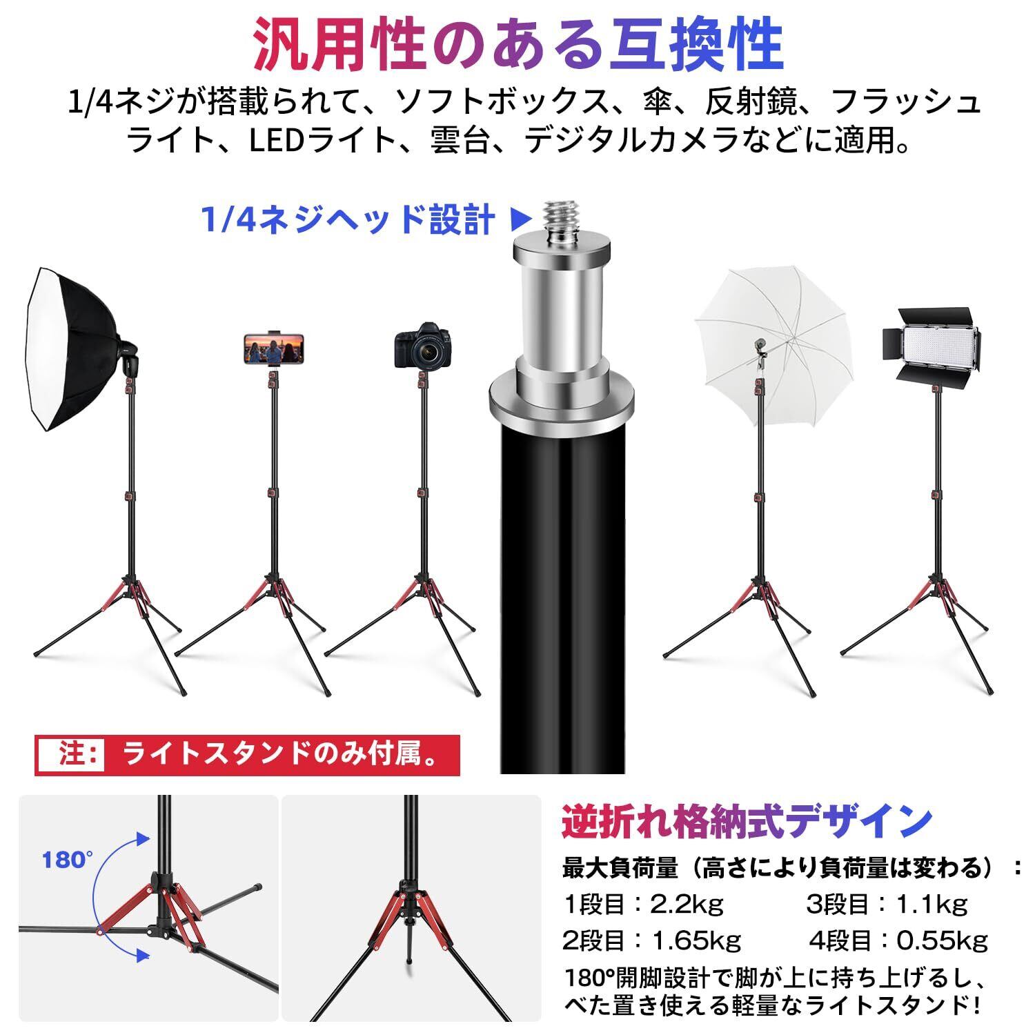 【パッケージ内容と製品規格】:✨❶プロの逆向き折り畳 ライトスタンド(長さ189cm) x1、❷専用収納ケース x1。 ✨❶材質:アルミ合金製+ABS、❷伸縮段数:4段階、❸最大高さ:189cm、❹収納高さ:49cm、❺最大パイプ直径:26mm、❻最小パイプ直径:13mm、❼最大負荷量:2.5kg/本、❽本体重さ:0.66kg/本。✨ご注意:ライトスタンドの1/4ネジヘッドを輸送による損傷から保護するために、黒い蓋をかぶってあるまま出荷しております。ご使用する前に、先ず黒い蓋を外してください。