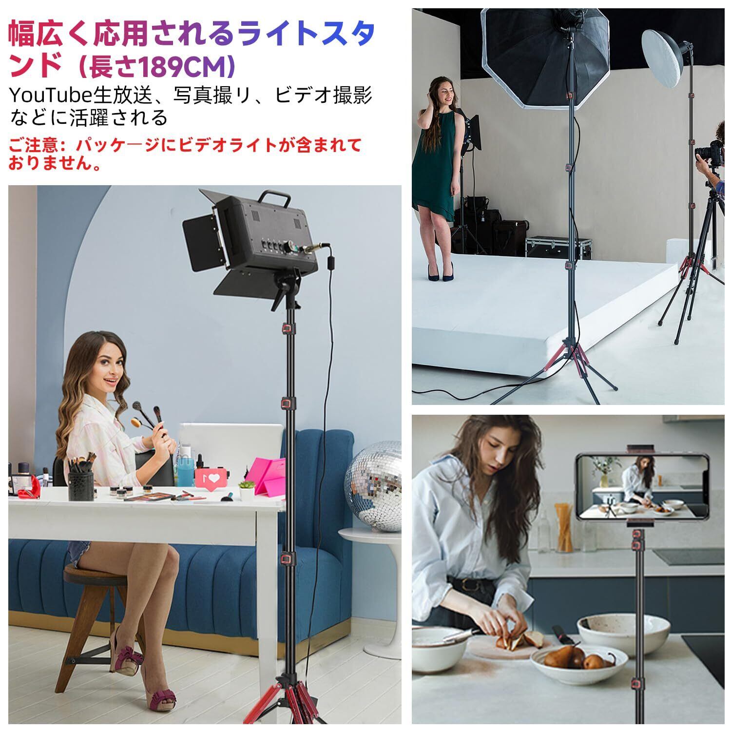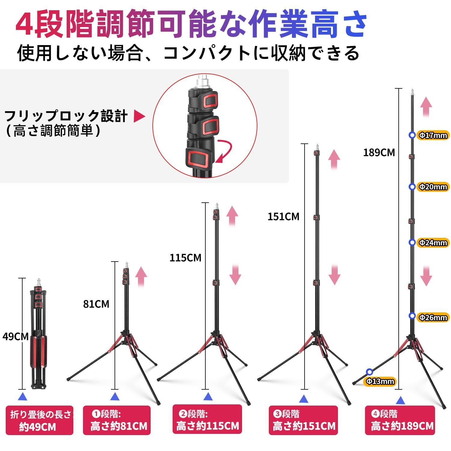 【4段階伸縮のコンパクト ライトスタンド】:フリップロック設計のライトスタンドにより、フリップロックを開け閉めするだけで三脚 スタンドの高さを4段階自由に調節できます。✨収納高さ:49CM ✨1段目高さ:81CM ✨2段目高さ:115CM ✨3段目高さ:151CM ✨4段目高さ:189CM ✨ご注意:ライトスタンドを必要とされる高さに調節できたら、必ずフリップロックをしっかりと締めてください。