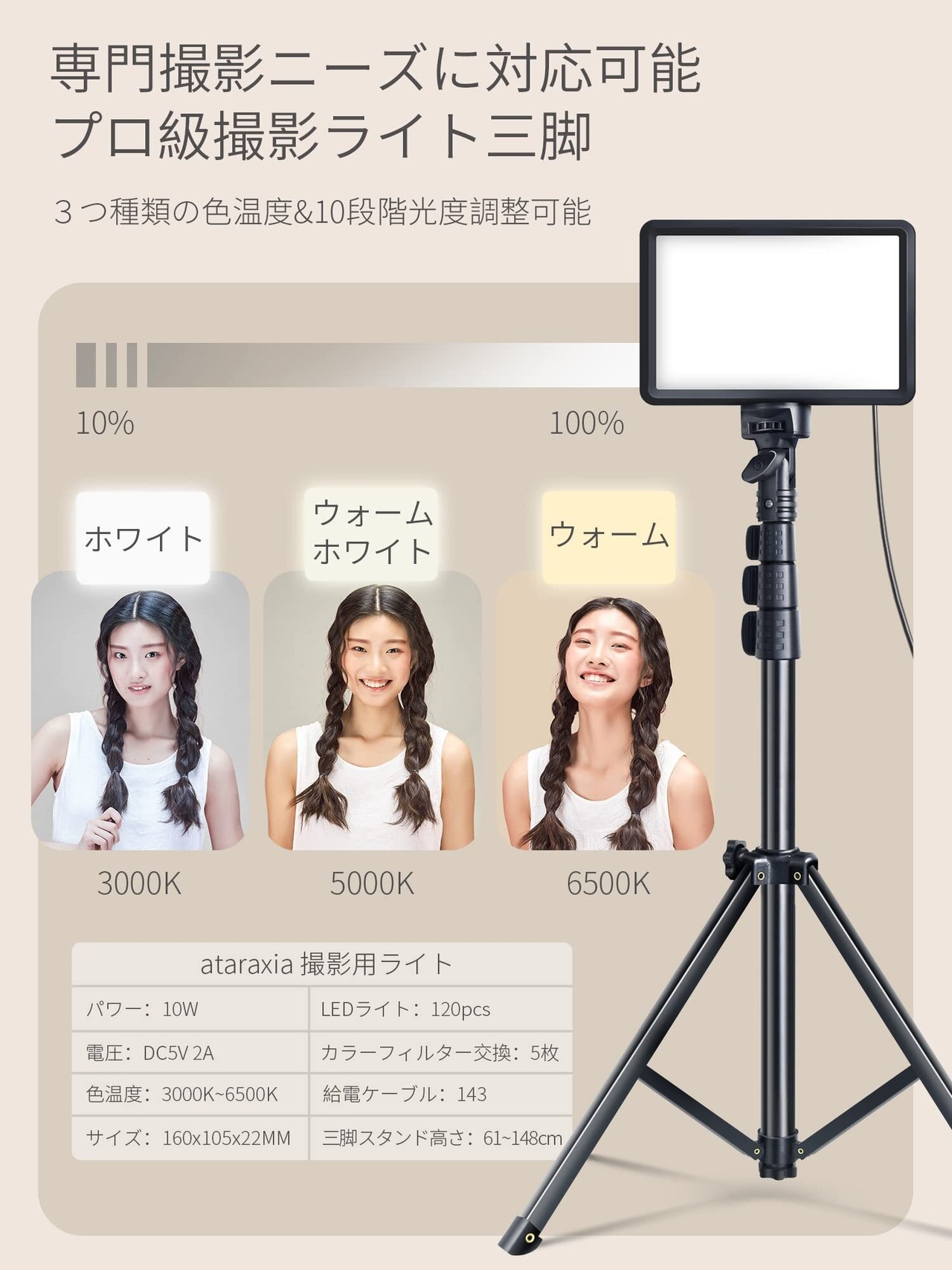 ■【プロフェッショナルな撮影を可能にするLEDライトセット!】ataraxiaの撮影用ライトは、コンパクトながら非常に明るいLEDを搭載!直感的に使用できるUSB接続で、様々な撮影シーンに最適です。66-145cmの高さ調節が可能な三脚が付属しているため、思い描くライティングを自由に演出できます。