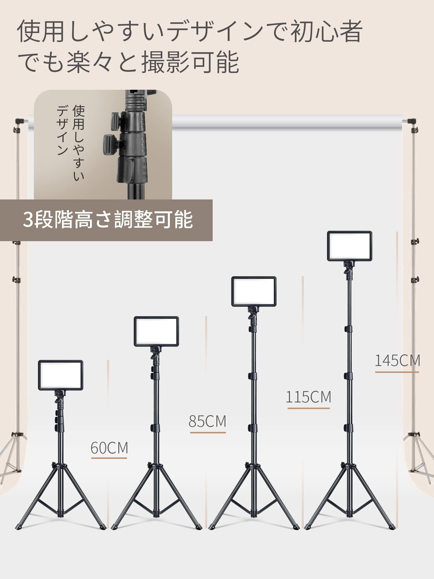 【61cmから148cmまで伸縮可能・360°回転と180°両側反転可能】付属品三脚スタンドは61cmから148cmまで3段階伸縮可能で、卓上照明、自撮りなどのシーンに対応できます。LED撮影用ライトの接続部分に自社開発360°回転するまたは180°両側反転可能運台を搭載し、思い通りの部分にライトを向けられ、好みの角度に調整して固定できます。十分な高度で頑丈な三脚の安定性がしっかり確保しております。