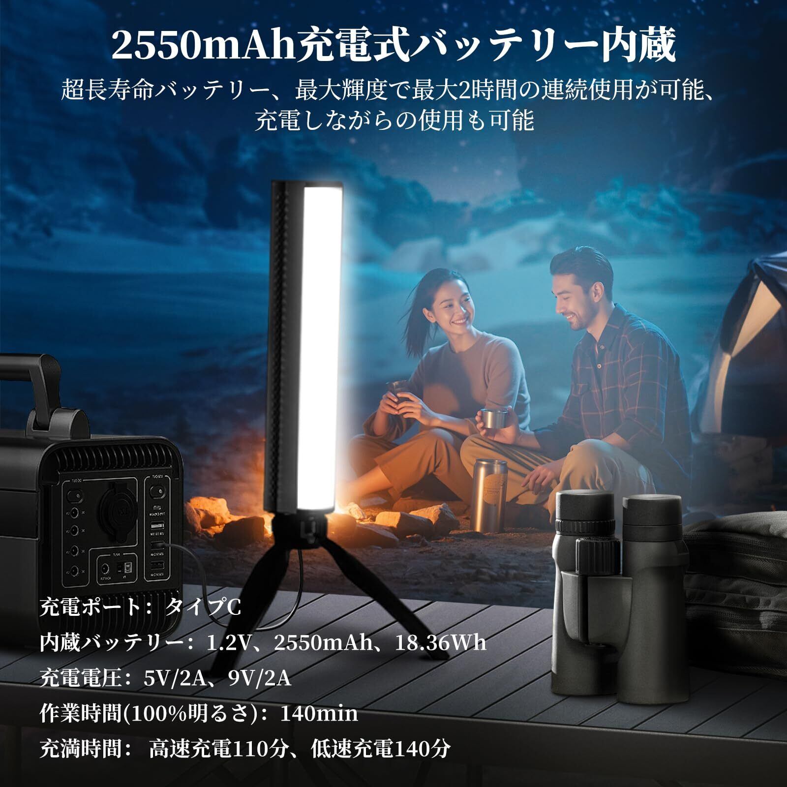 【大容量充電式バッテリー&PD3.0急速充電対応】TL21C RGB撮影用ライトバーは2550mAh大容量バッテリーを内蔵、屋外撮影に最適な携帯性を実現。最大輝度で最大140分間の連続使用が可能。PD3.0急速充電プロトコルに対応したType Cポートによる急速充電に対応し、約2時間でフル充電が完了。充電しながらの使用も可能なため、長時間にわたる使用シーンでも電切れの心配がありません。