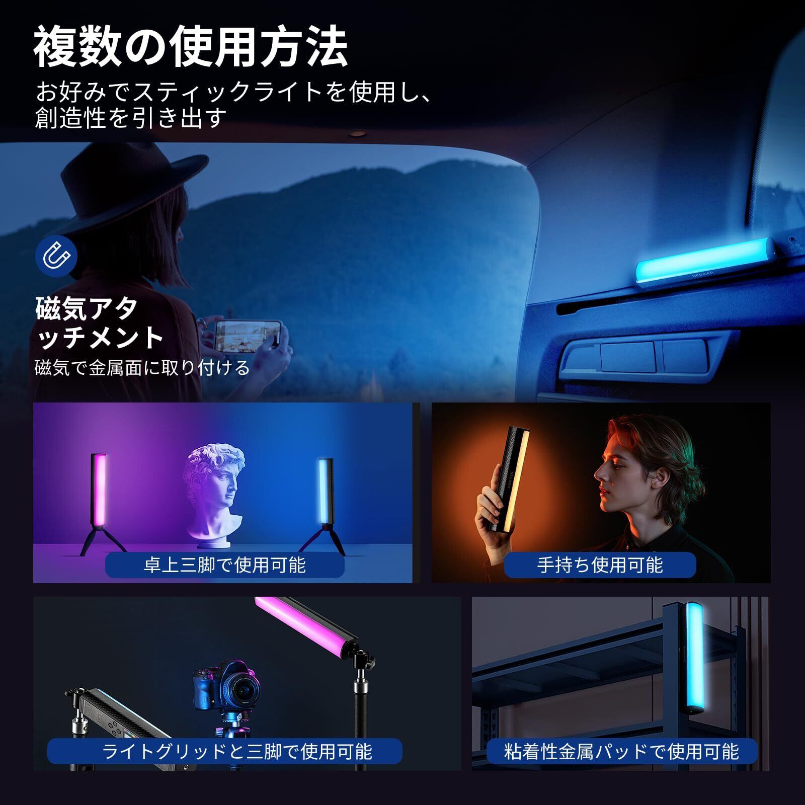 【マグネット式&1/4ネジ穴による多様な設置方法】内蔵強力磁石では金属面への直接磁着を実現。高角度・低角度・俯瞰撮影など、多様なアングルから光を演出できます。両端に標準規格の1/4ネジ穴により三脚や卓上スタンド(別売)への取り付けが可能。クリエイティブな照明配置を即時実現。カラオケやライブ会場、屋外ステージなどでそのまま保持すれば、臨場感あふれるムード照明や効果照明を簡単に作り出せます。ご使用中何かご質問がございましたら、お気軽にのカスタマーサポートまでお問い合わせください。