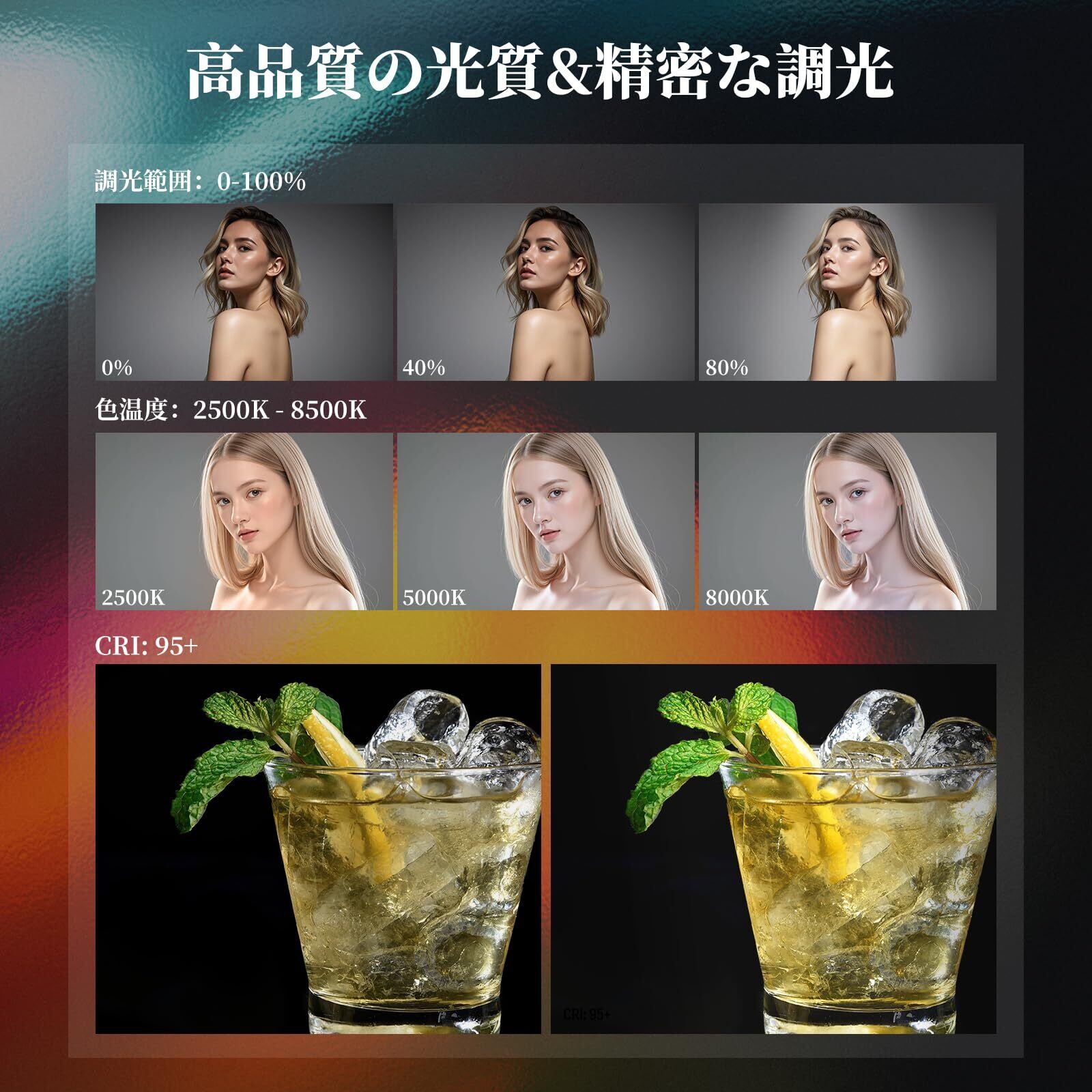 ■【APP制御で簡単操作!】専用アプリを使って、直感的に明るさや色を調節することができます。これにより、撮影のニーズに合わせて自由自在にライティングをカスタマイズできるため、クリエイティブな表現が広がります。