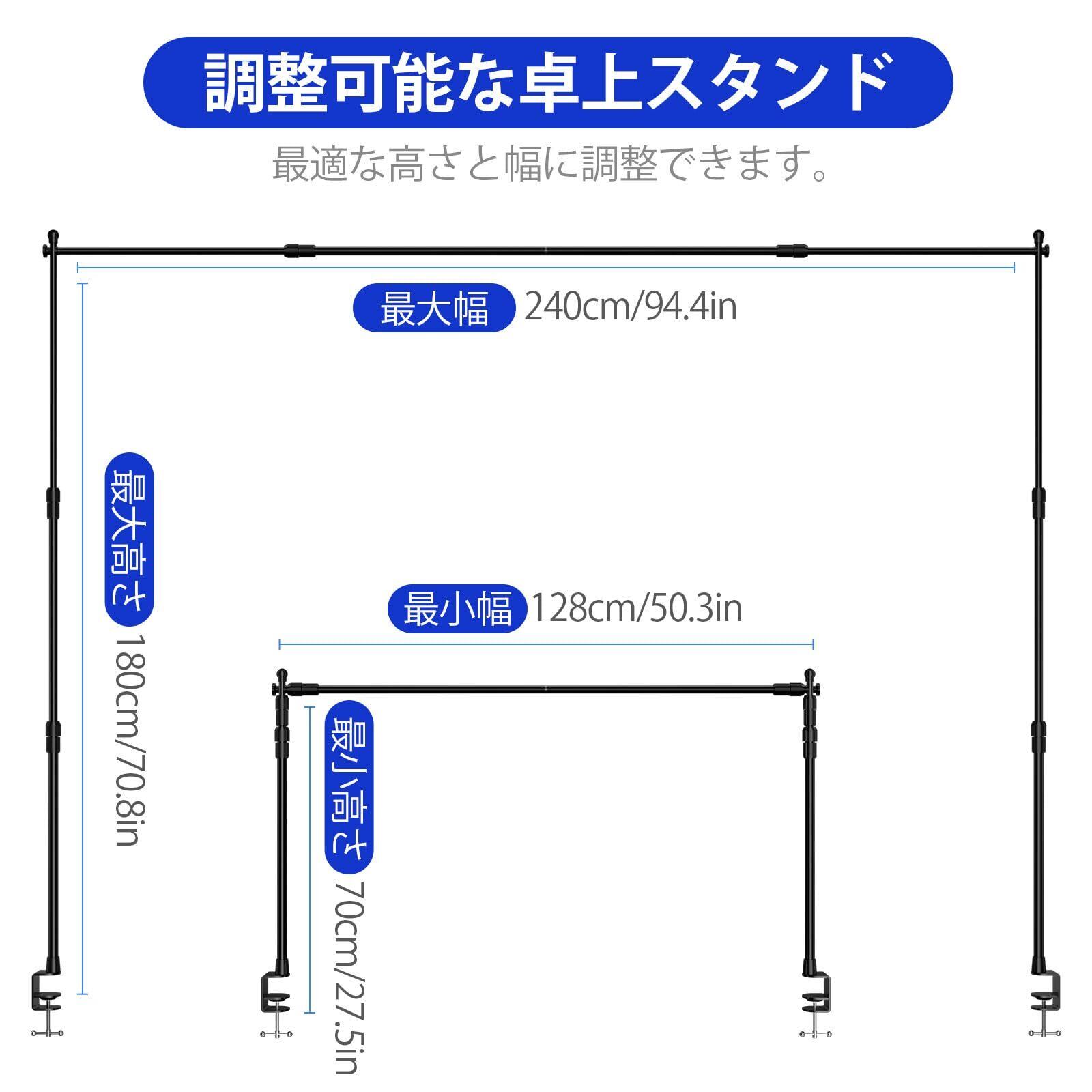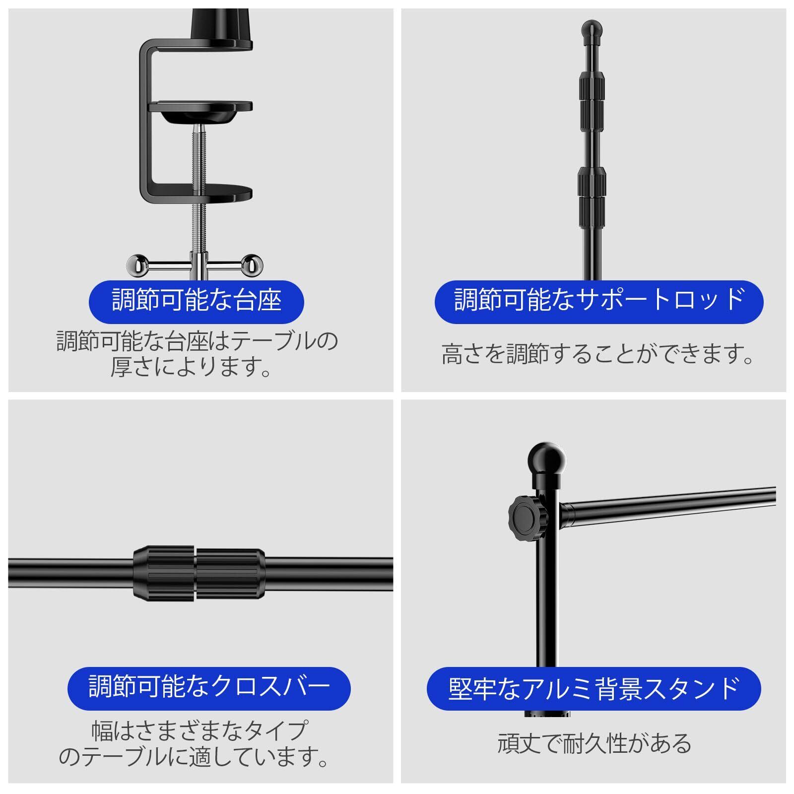 【高品質な卓上背景スタンド】:調節可能な台座はアルミ材料を採用し、頑丈で耐久性があるだけでなく、安定しており、何度も繰り返し使用できます。また、腐食や錆びなどが発生しにくいという特徴があります。重さ2.6kgで、軽量の設計で持ち運びも簡単です。頑丈なサポートロッドはしっかりと締まり、テーブルの側面にしっかりと置くことができます。