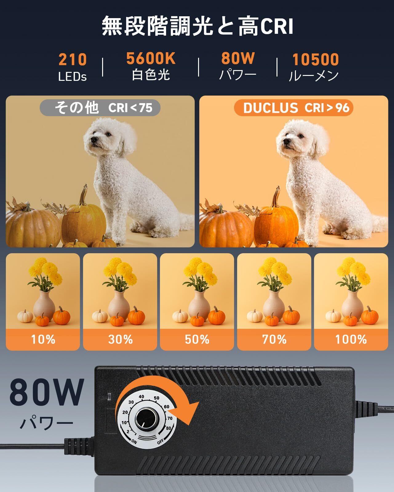 ■【無段階調光機能で理想の明るさを実現!】無段階での調光が可能なので、あらゆる撮影条件に対応できます。撮影対象に合わせて明るさを調整することで、最適な撮影環境を整え創造力を引き出します。