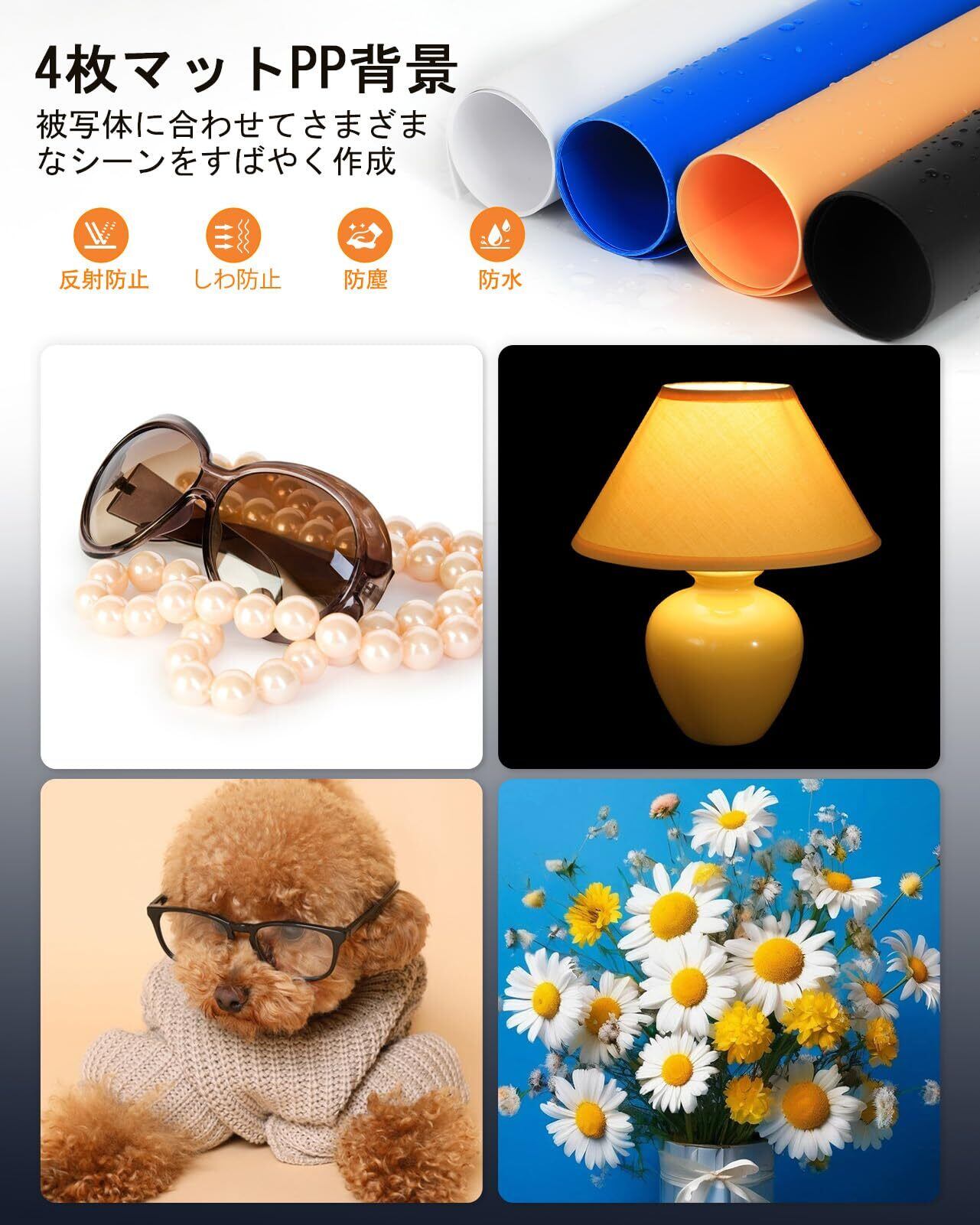 【4色のプロ用背景】この100cm撮影キットは4枚のPP材料マット背景(白/黒/ライトオレンジ/青)が付属しており、シワになりにくく、防水、防塵、清掃が簡単で、PVC材料よりも反射しにくく、紙よりも耐久性があり、多様な撮影シーンを素早く構築することができます。