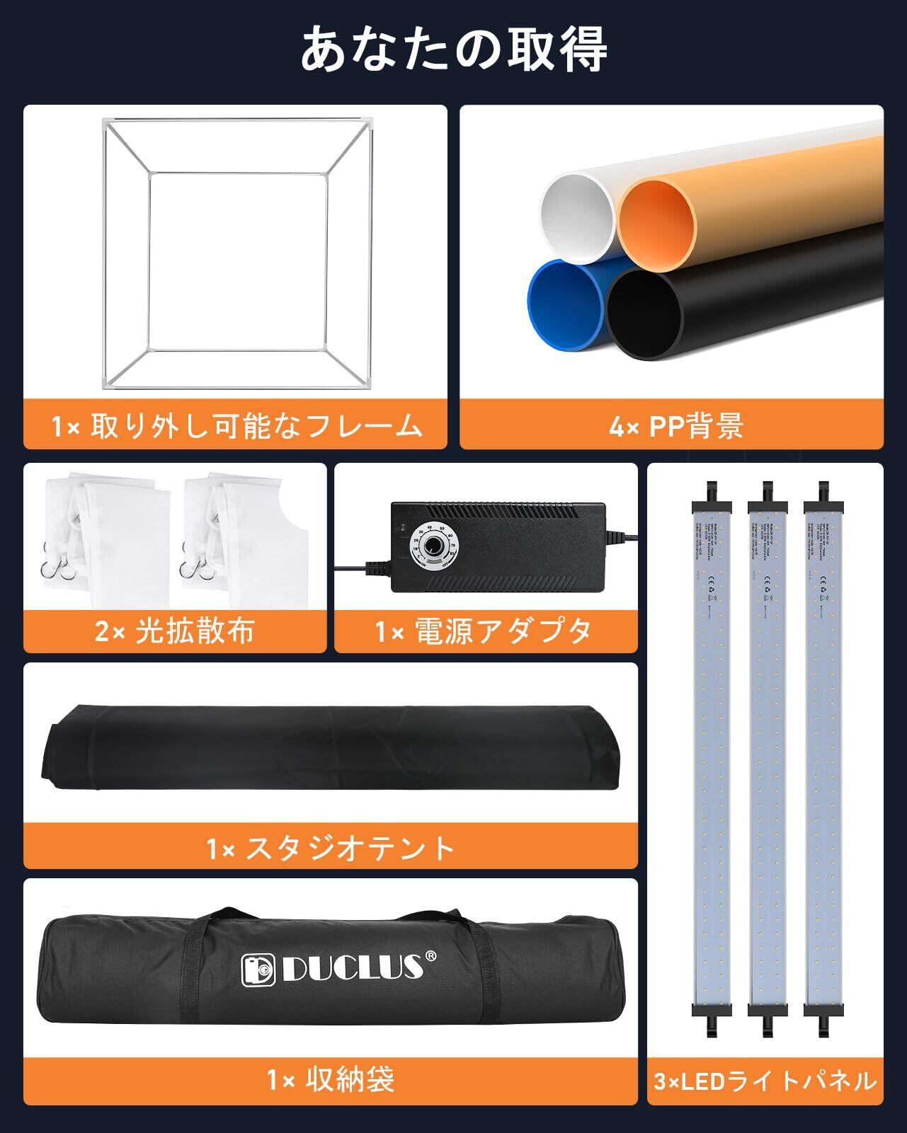 【2025最新】DUCLUS 撮影ボックス 100cm 撮影キット 折りたたみ、高い CRI>96 の 10500LM LED ライト、無段階調光、360° 調節可能ライトパネル、4色マットPP背景 大型商品撮影用