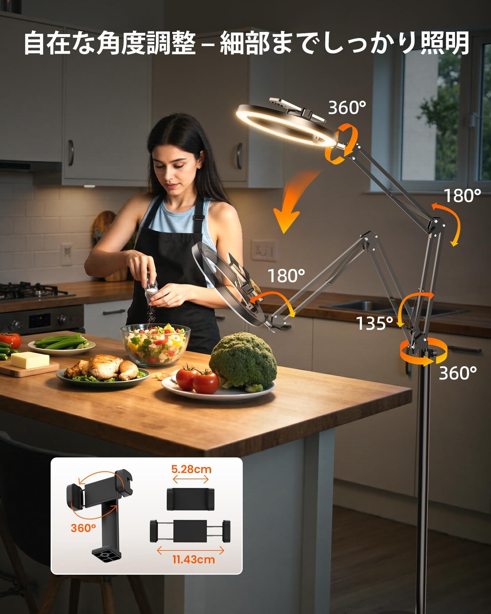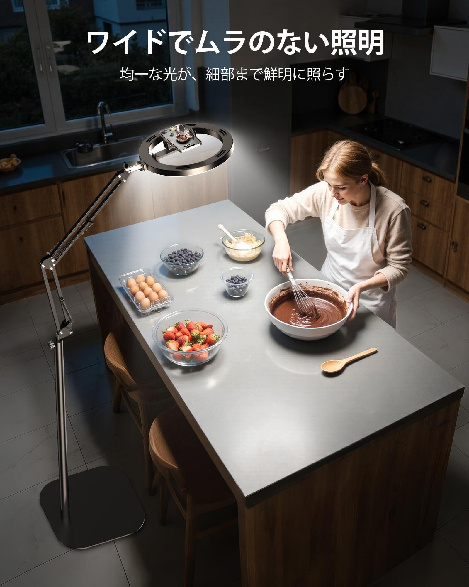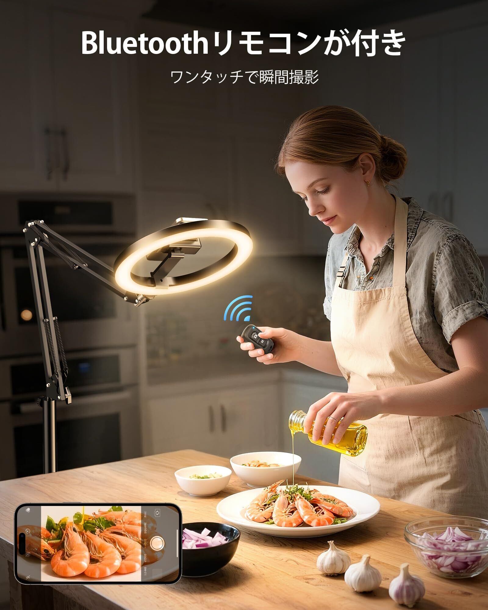 ■【柔軟なアームで自由自在に調整!】リングライトは便利なアーム式デザインで、45度から360度まで自由に角度を調整可能。真上からの撮影がやりやすく、どんなシーンでも理想の照明を実現できます。自宅での物撮りやメイクアップ、Zoom会議でも大活躍!