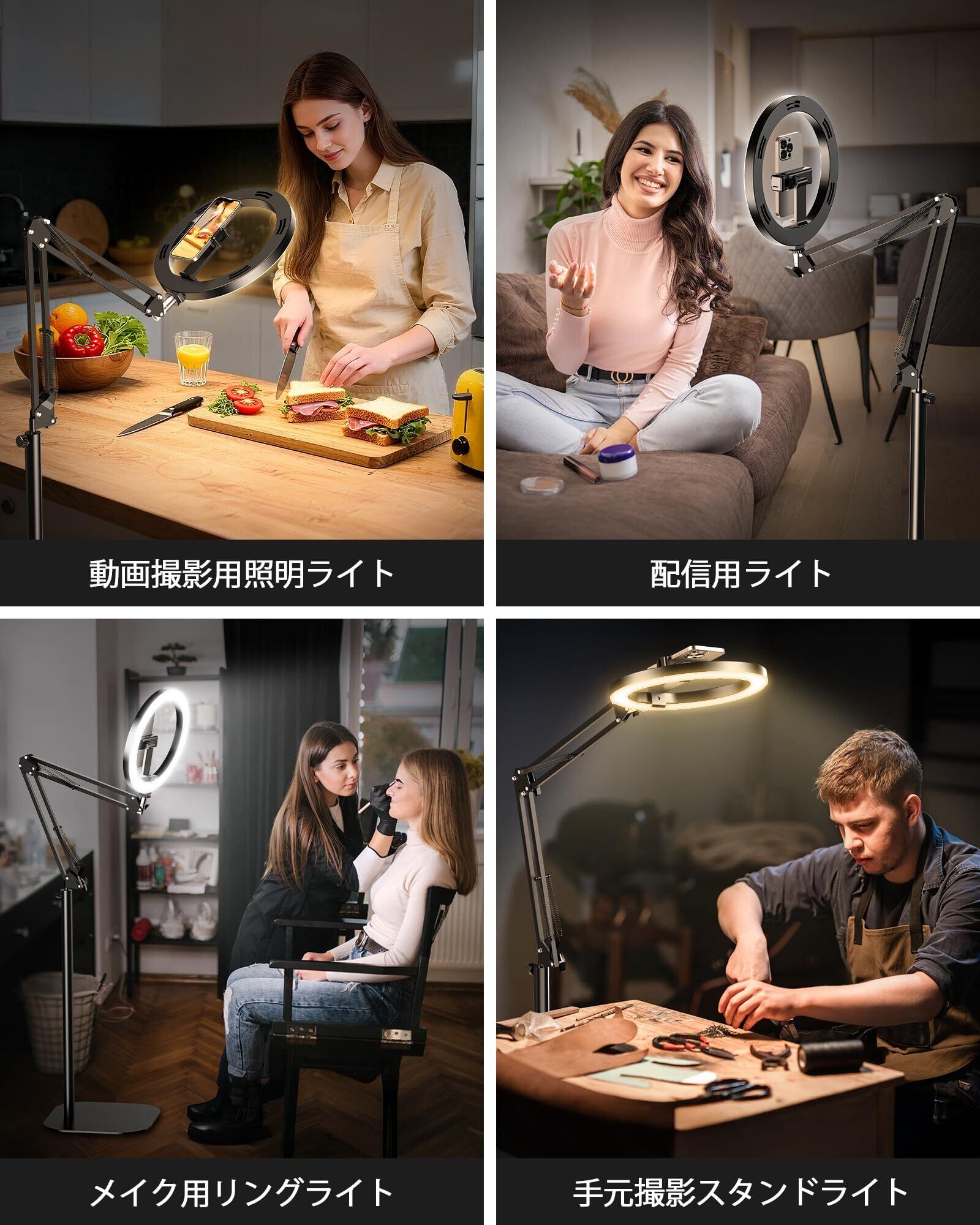【2025最新版スタンドのリングライト】俯瞰撮影以外にも、このリングライトは多目的に活用できます。配信用や絵を描く際に手元を撮影するためにも利用できます。また、パソコン会議やメイクの際にも役立ちますし、読書時にも手元を照らすのに最適です。従来の三脚スタンドは安定性がなく、揺れやすく、場所をとり、角度調整が自由にできないという使用者の意見を受けて、私たちは1万人以上のリングライトユーザーの要望と提案を総合し、この安定性が高く、耐荷重性に優れ、場所を取らず、かつ柔軟なスプリングアームサポートを備えたリングライトを設計しました。
