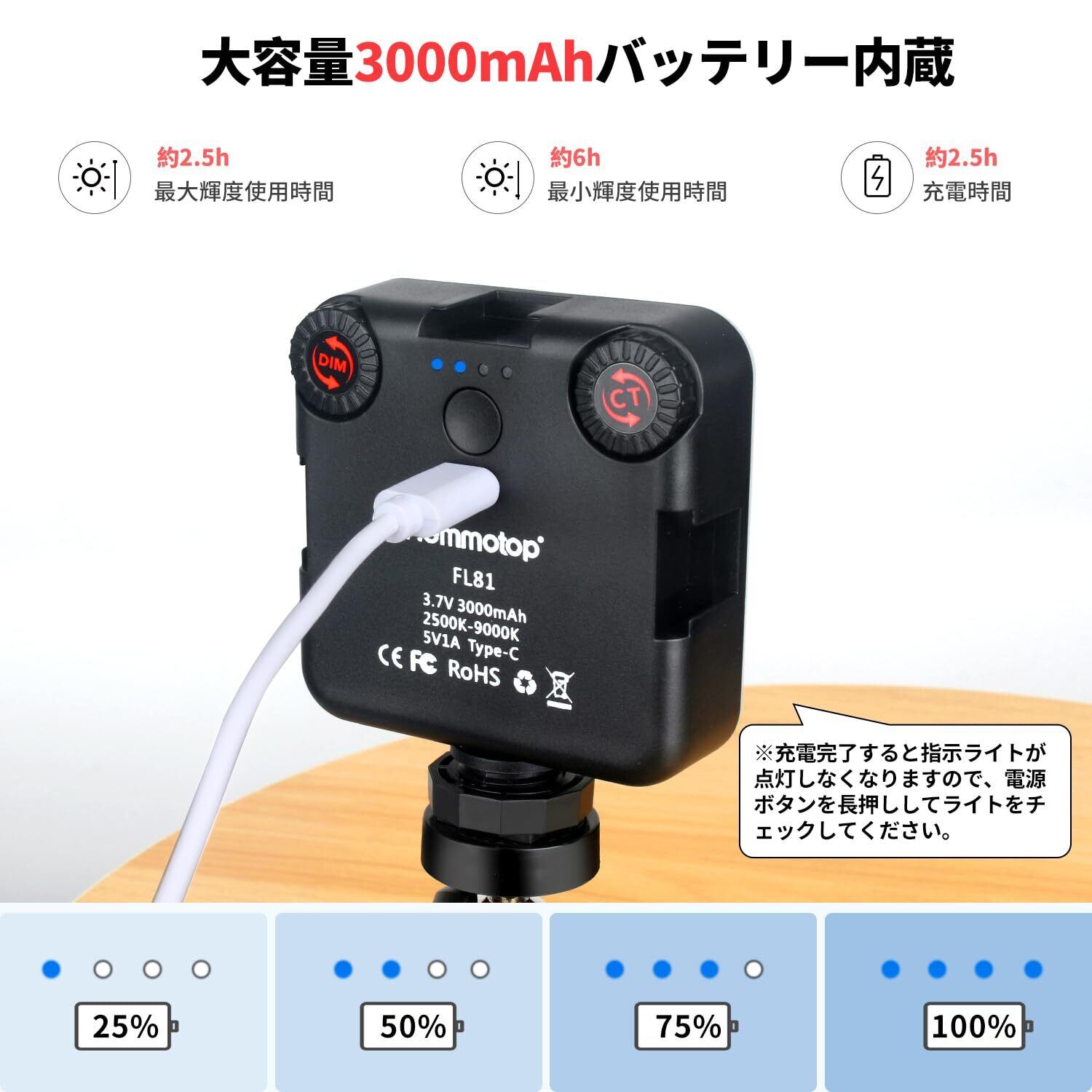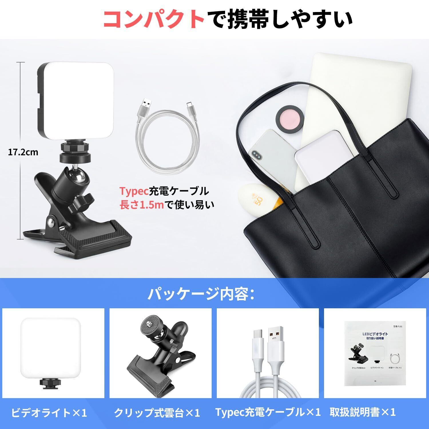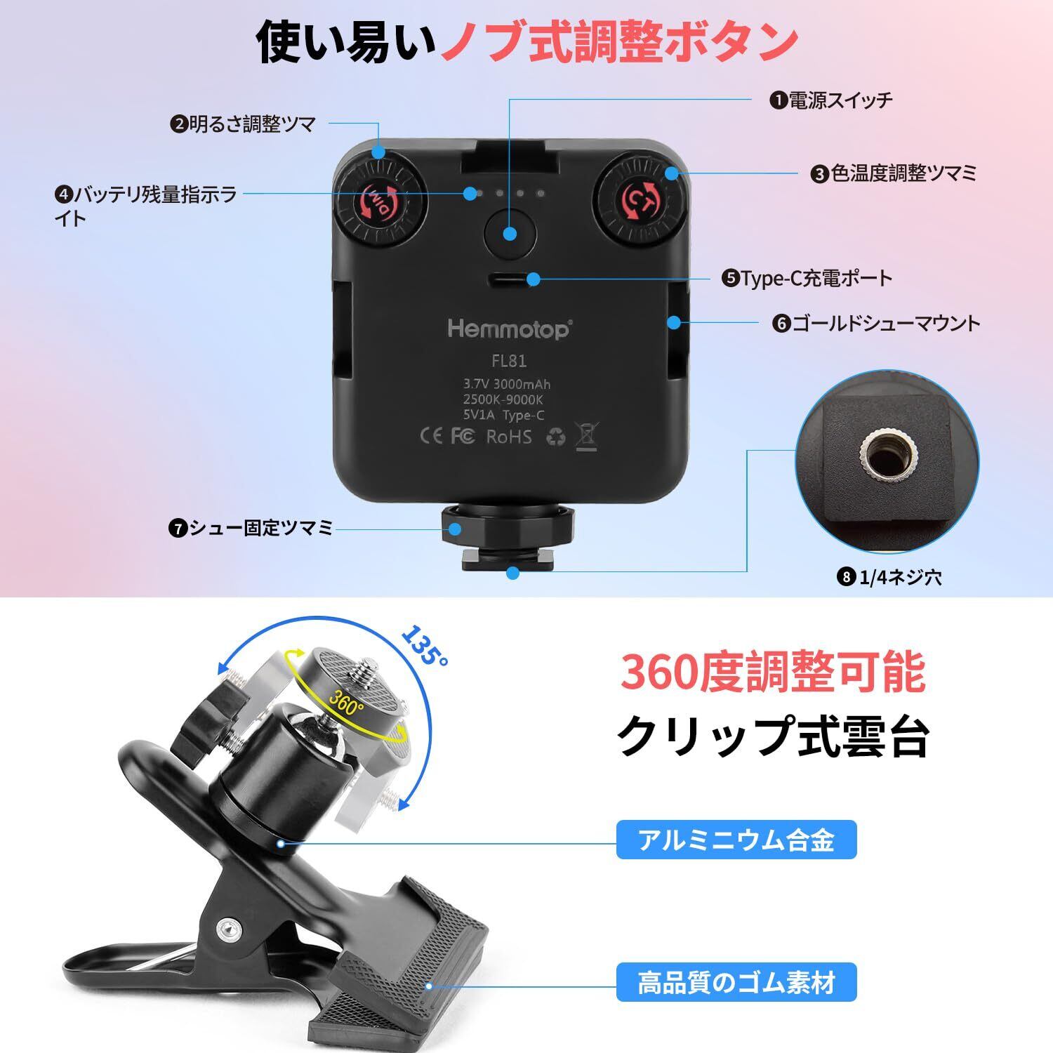 Hemmotop LED ライト 撮影 照明 クリップ式雲台が付き ビデオライト 81球 コンパクト 充電式 3000mAh 2500K-9000K Ra95+ 調光 最大1000Lux 配信 デジタルカメラ DJI Osmo Pocket Canon Nikon Sony zoom用 コード長約150cm