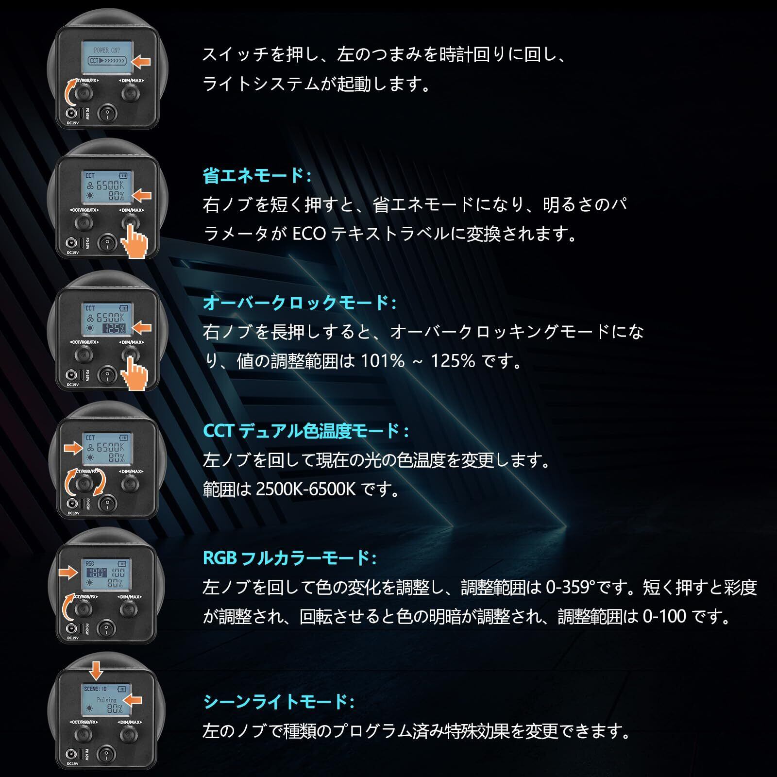 【液晶パネル搭載・本体で簡単操作】 調光はライト本体の操作パネルで直接行え、本体にはボタンが3つしかないため、切り替え操作は非常に簡単です。大きな液晶パネルで操作も簡単です。省エネモード:DIMノブを1回短く押すと省エネモードになり、最低輝度が1%になります。オーバークロックモード:DIMノブを長押しするとオーバークロックモードになります。 輝度は最大125%まで調整可能です。最大出力は50Wです。