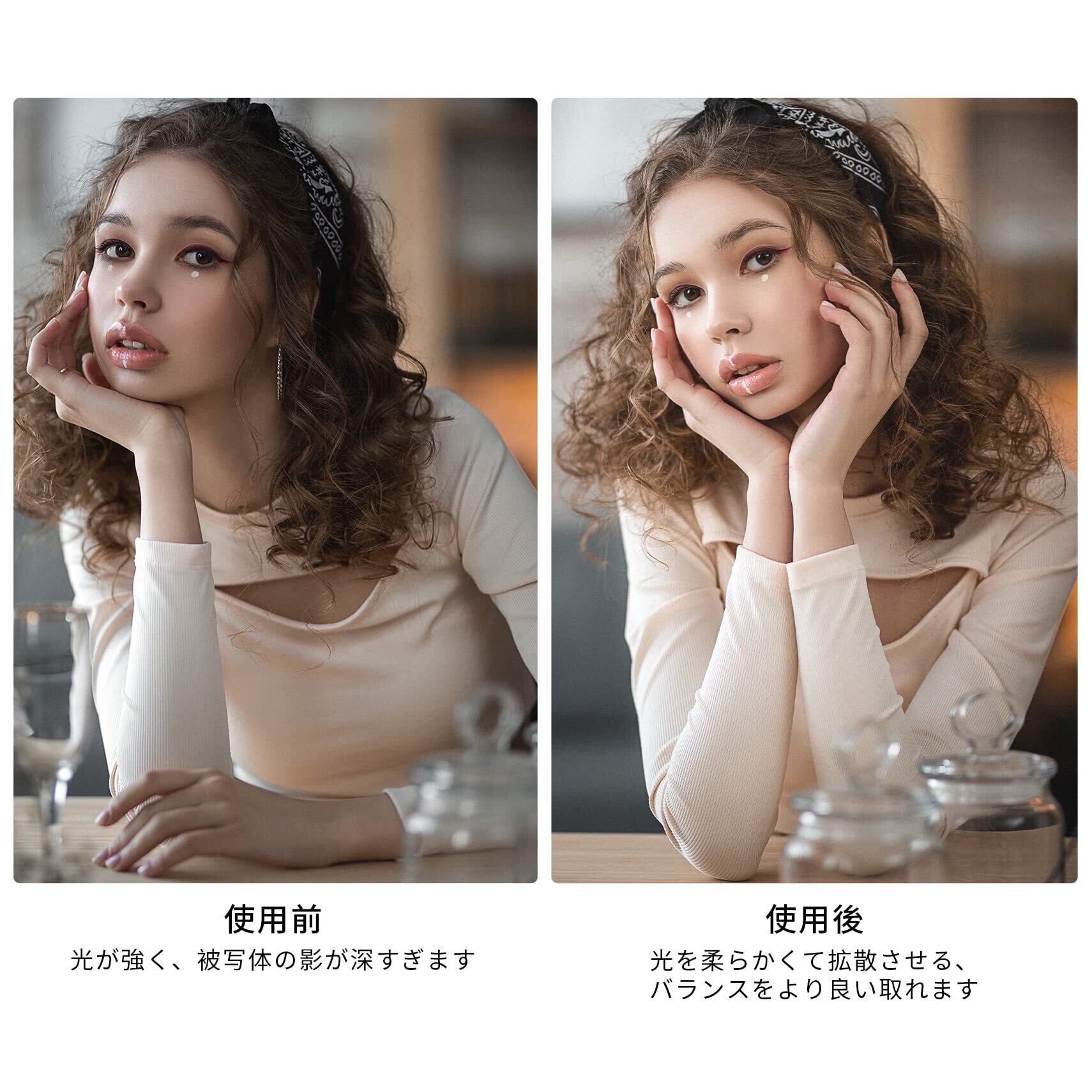 フラッシュや太陽光などの自然光からのバランスをより良い取れて、光を柔らかくて拡散させる、安定な照明を撮ることができます。