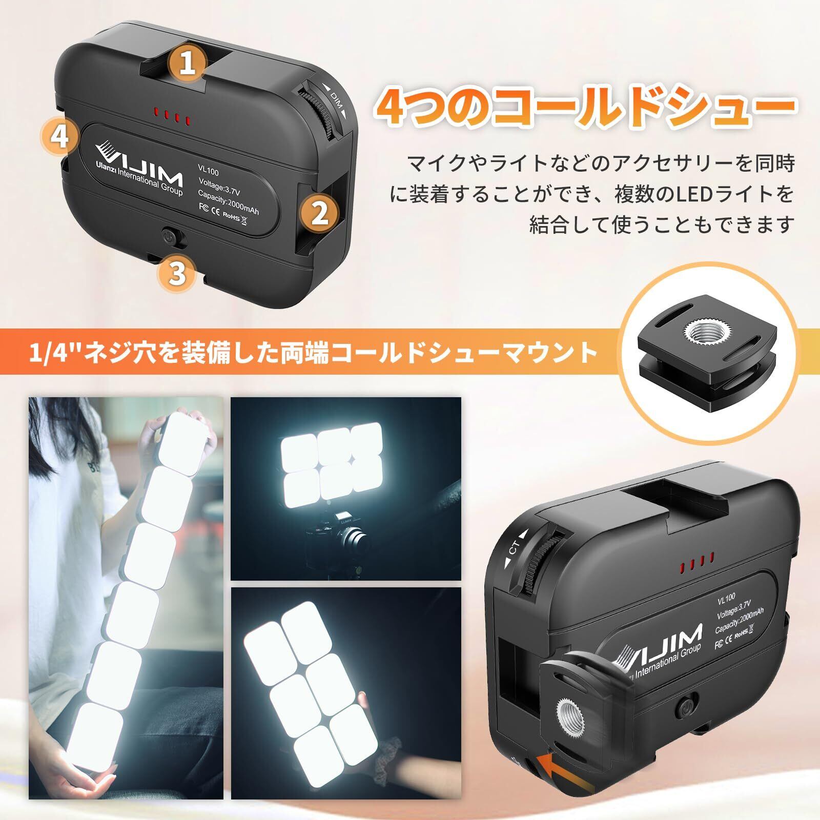 【コールドシュー付き】ミニライトには4つのコールドシューがあり、マイクやライトなどのアクセサリーを同時に装着することができます。また、1/4"ネジ穴を装備した両端コールドシューマウントも付属しています。カメラ、三脚、ライトスタンドなどのスタンドに取り付けられます。複数のLEDライトを結合して使うこともできます。旅行時のVlogや、LEDを初めて使いたい初心者にもオススメ。**コールドシューの両端は、複数のライトを接続する場合にのみ使用を推奨し、スマホホルダー、三脚のコールドシューには使用できません