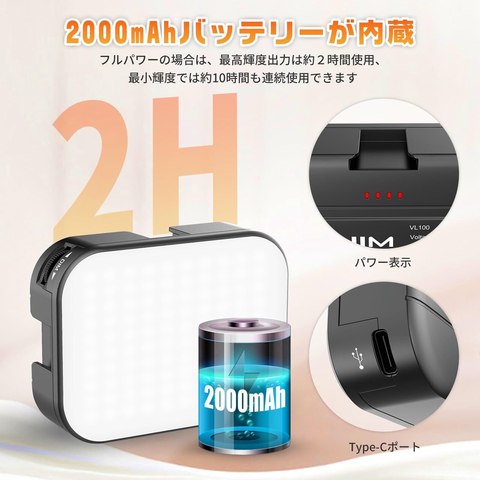 【2000mAh USB-C充電式】ビデオライトは2000mAh大容量バッテリーが内蔵しており、充電時間は約2時間です。フルパワーの場合は、最高輝度出力は約2時間使用、最小輝度では約10時間も連続使用できます。Type-Cの充電ポートが付いおり、屋外で使ったり、室内でもコンセントから給電して安定して連続使用することができ、バッテリー不足の心配はありません。補助照明、gopro ライト、屋外や屋内の照明、広告写真、夜の懐中電灯、YouTubeの撮影、会議、旅行時のVlog、ビデオ通話、カメラ照明撮影等幅広いの場面でも楽に適用します。