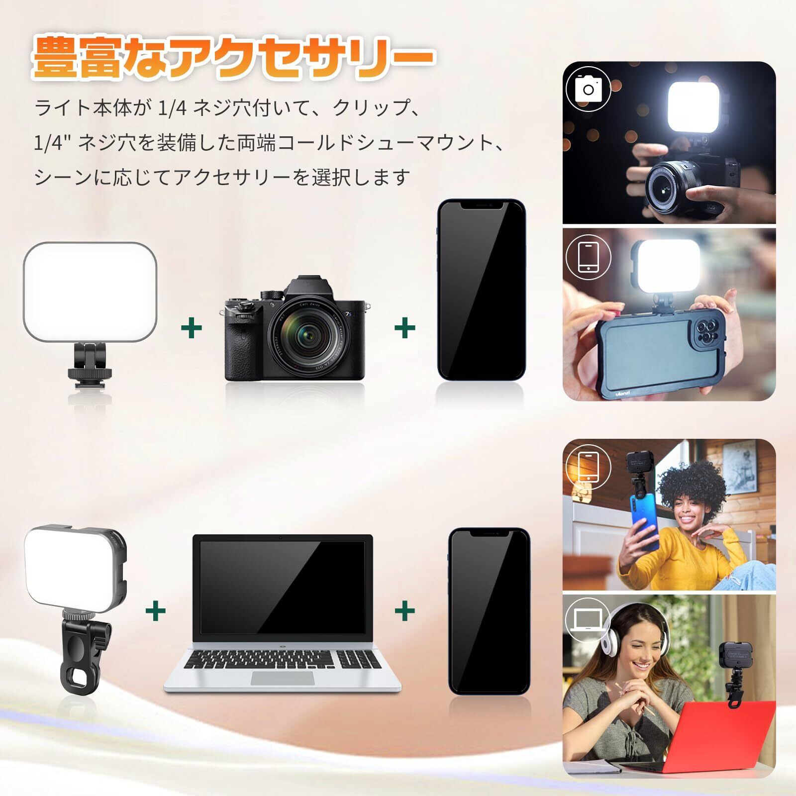 【クリップ式 ·角度を自在に調整】170度回転可能なコールドシュー雲台を搭載、回転させることで、光源の向きを上下に調整することができ、より良い撮影照明効果を達成します。または、クリップマウントを付き、クリップ幅は2cmで、パソコン、スマホipadなどのデバイスに適用。Zoomオンライン会議、Web面接、テレワークだけでなく、自撮りライト、女優ライト、屋内外の照明、広告写真、YouTubeの生放送など幅広い場面でご利用いただけます。