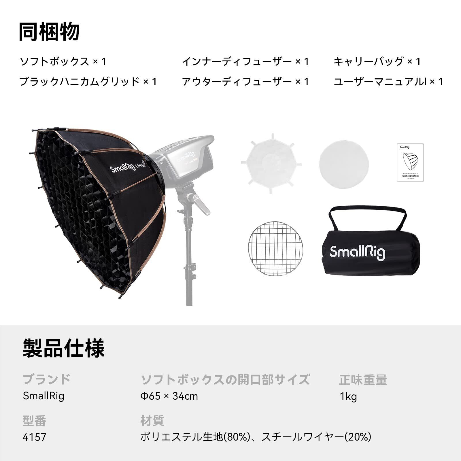 【軽量で折りたたみ可能】SmallRig LA-D65 パラボリック ソフトボックス 4157の重さはわずか 1 kg で、折りたたんで簡単に保管できるため、複数の場所で撮影する写真家に便利です。