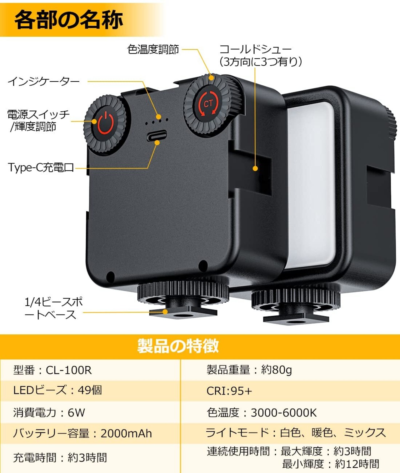 【小型・薄型で持ち運びやすい動画撮影用ライト】6.6*6.5*2.8cmのコンパクトなサイズとわずか85gの重量、スマホより小さめで軽量で、カメラに直接つけても違和感なく使用できる。また、USB Type-Cの充電口は急速充電に対応します。なお、充電しながらも使えますので、バッテリー不足を心配する必要がありません。