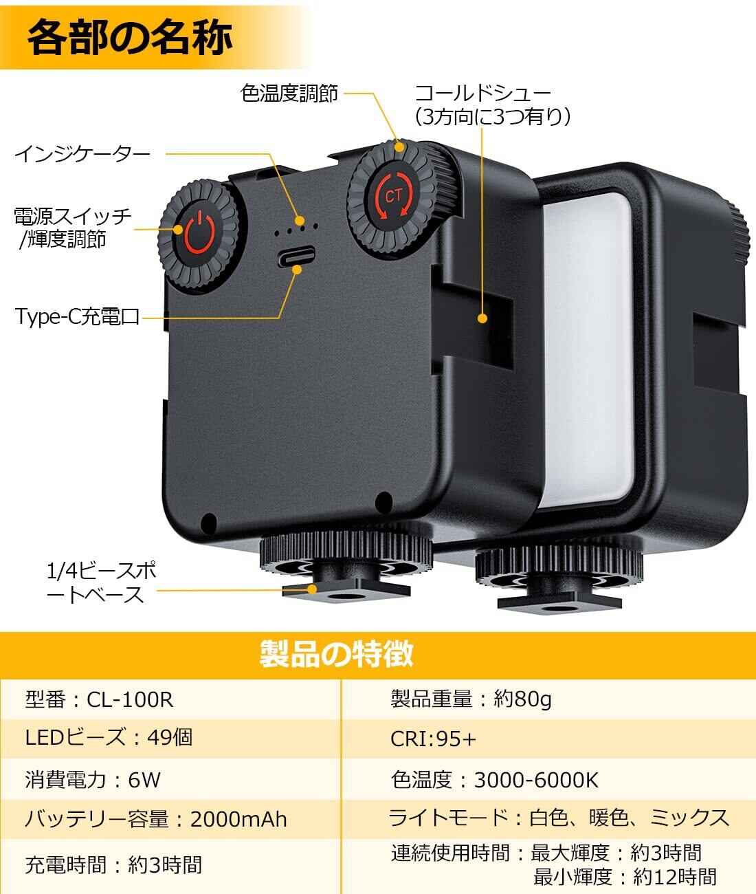 【革新モデル】 LEDビデオライト 撮影ライト カメラライト 無段階調光調色 360度回転 小型 3000K-6000K CRI95+ 補助照明 撮影用ライト Type-C USB充電式 自由雲台付属 iphone/Gopro/Osmo Pocket/Samsung/Nikon/Canon/Sony/アクションカメラに適用