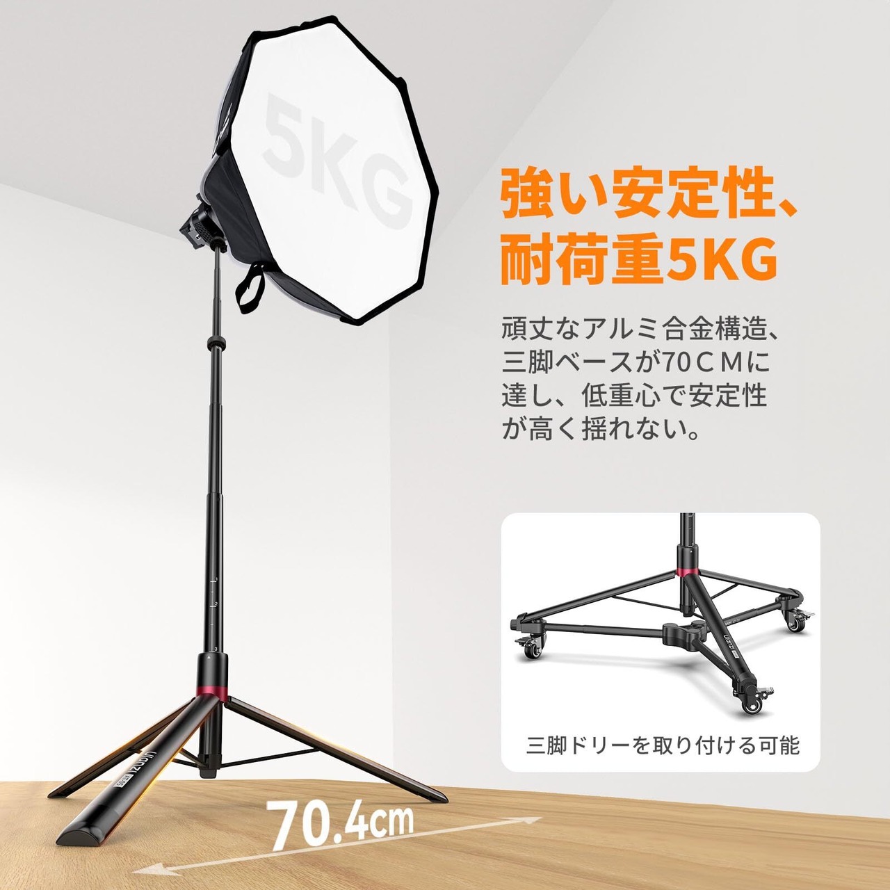 【安定性UP、耐荷重5KG】Ulanzi AT-05 ライトスタンドは全アルミ製で、耐久性に優れています。また、三脚部に二重アルミ合金部品強化設計で、脚直径が70cmに達し、他の三脚よりもっと広く、安定性が更に良くなります。足部分が滑り止めのゴムが付いて、床を傷つけることなく、地面をしっかりとグリップします。 収納長さが48CM、 重さが1100gで、コンパクトで持ち運びに便利です。