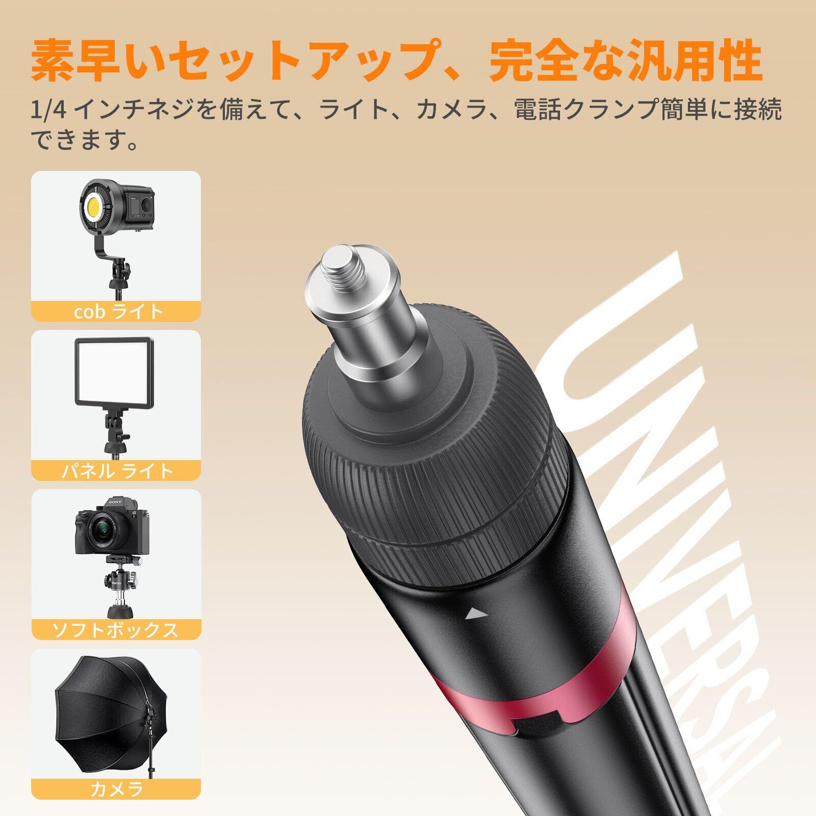 ■【多様な機材に対応する1/4"ネジ!】1/4"ネジが付属しており、撮影ライト、カメラ、一眼レフ、ソフトボックス、ストロボなど、さまざまな機材を簡単に取り付けられます。これにより、自由な撮影スタイルを実現し、様々なクリエイティブな表現に役立ちます。
