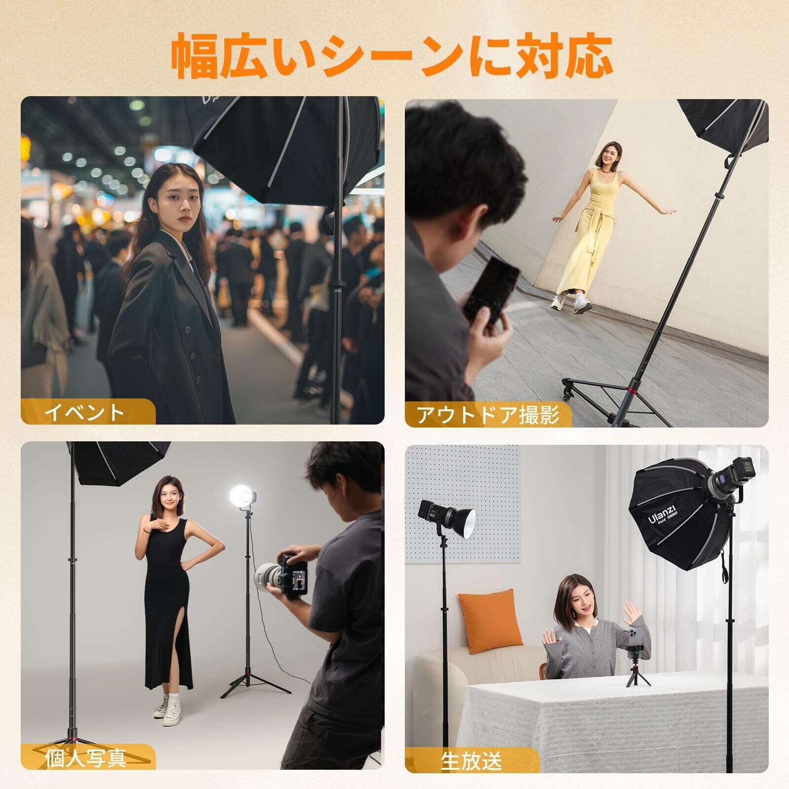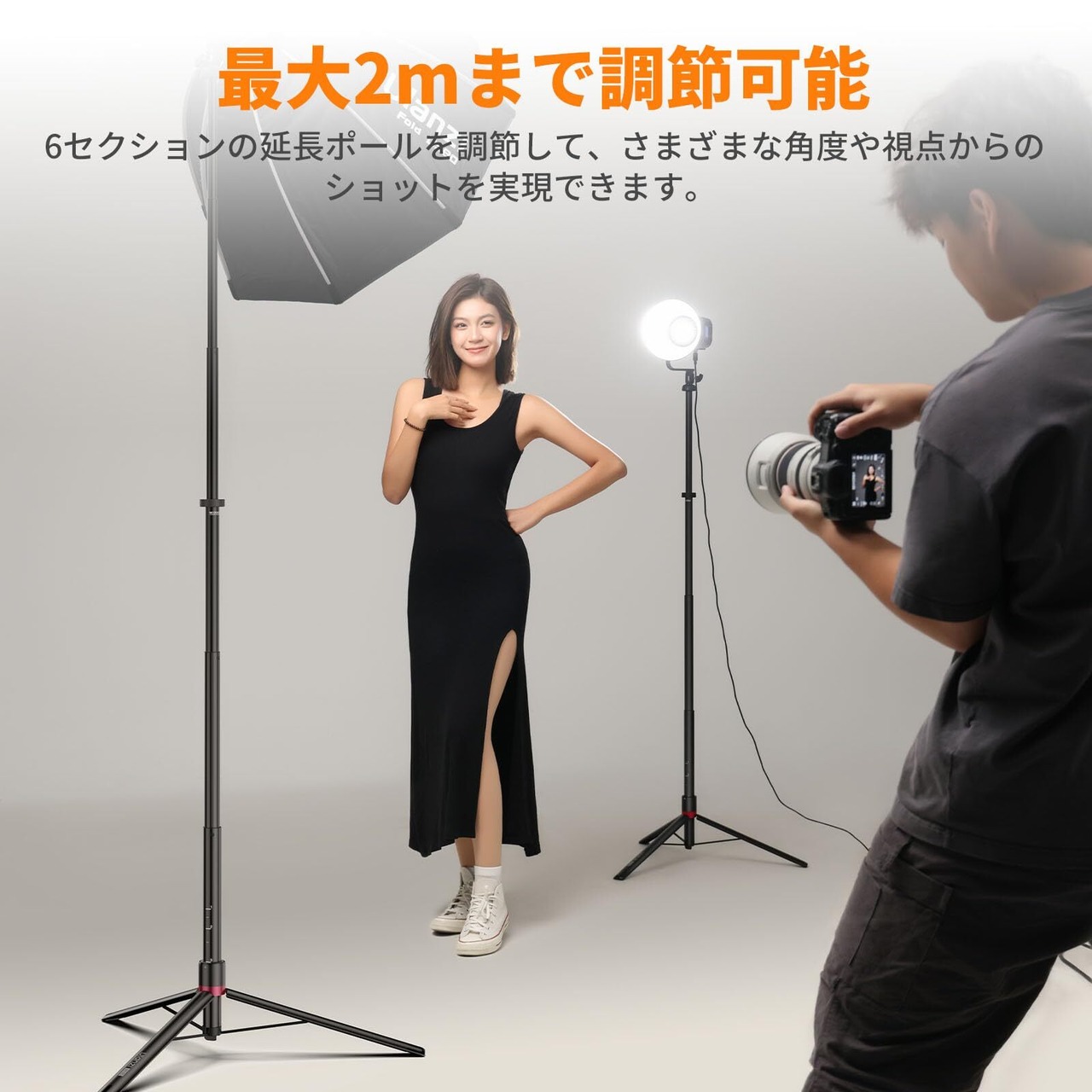 ■【6段伸縮で多様な高さ調整!】このスタンドは、最大200cmまで伸縮可能で、撮影シーンに応じて自由に高さを調整できます。高さ調整は簡単で、シームレスな操作が可能なため、ストレスなく撮影に取り組めます。