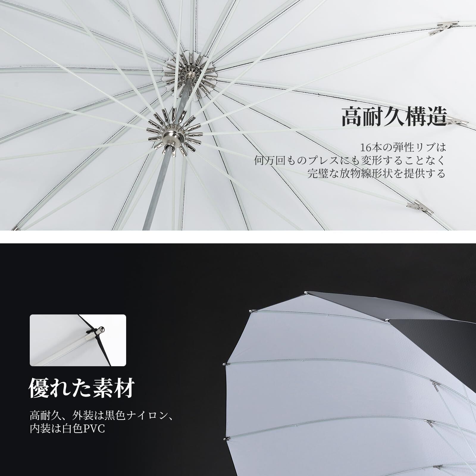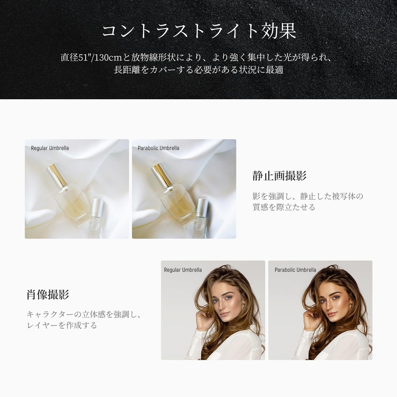 【51"/130cm黒/白パラボラ反射アンブレラ】51"/130cmパラボラアンブレラソフトボックスは黒/銀バージョンよりもソフトで均一な拡散光効果を提供し、忠実な色描写のためにニュートラルな色温度を保ちます。集合写真や広大な風景写真に最適です。放物線を描くようなデザインで、より広い範囲に光を届けます。