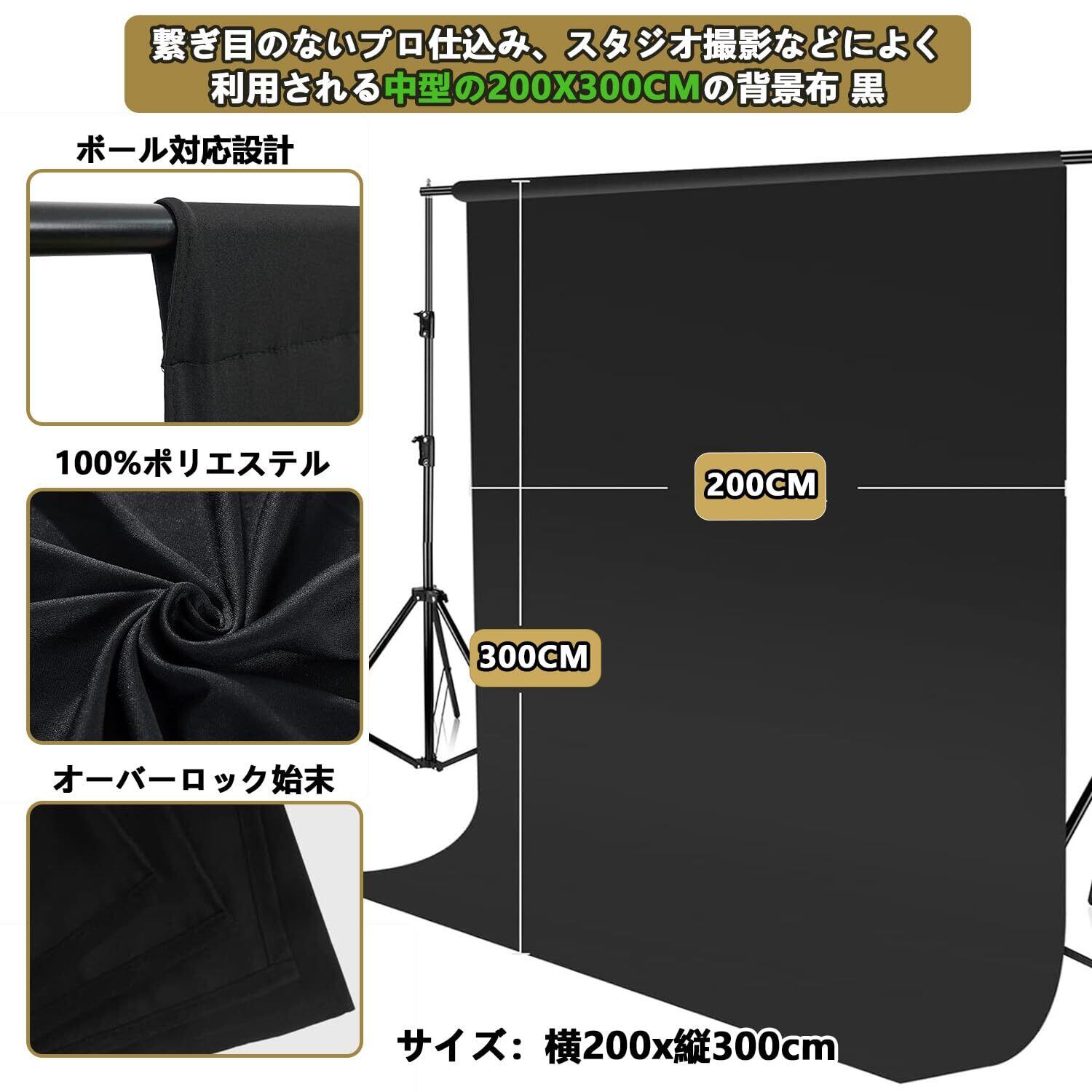 「継ぎ目の無い一枚布 & 幅広く応用可能」:1.撮影背景布 黒布は継ぎ目がなく、写真スタジオにもっとも利用されている200x300cmの背景布です。2.ホームスタジオ、クラブ、イベント、オフィス写真に理想的な製品です。3.ビデオ撮影、静物などいろいろな場面で大活躍です。