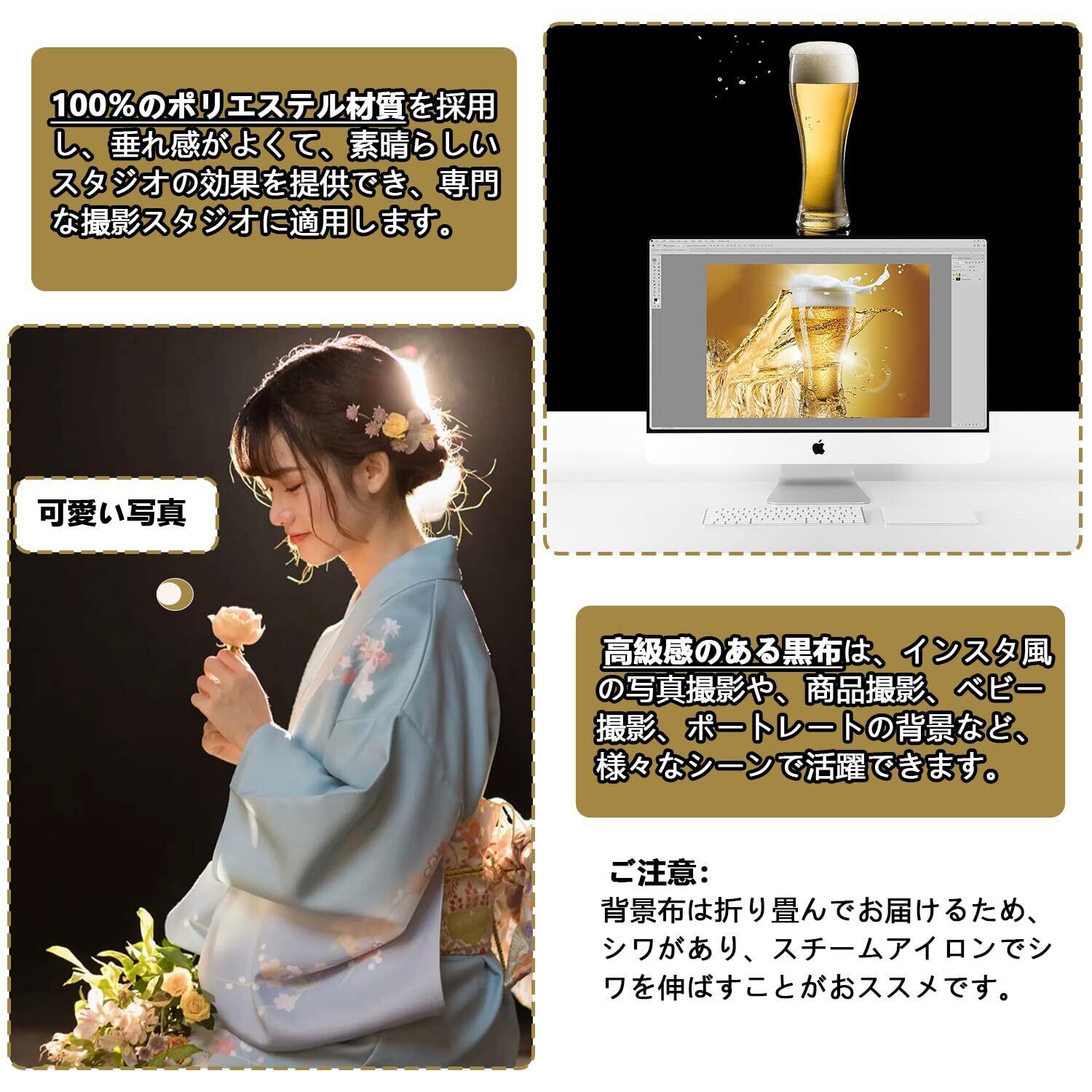 「商品撮影 & INS風の写真背景 & ポートレート・人物撮影」:1.自宅でも黒背景布一枚だけで簡単に商品を美しく撮影できます。急に決まった web会議 、部屋の汚れがお掃除せずに迅速に使用可能な黒布です。2.椅子やテーブルに巻きつけたり、ゴツゴツした壁の表面やロケーションに合わせセッティングが可能で、INS風の写真撮影にも対応可能です。3.ポートレート撮影・人物写真を綺麗に撮影できます。専門的な撮影スタジオにもよく使用される背景布 黒布です。