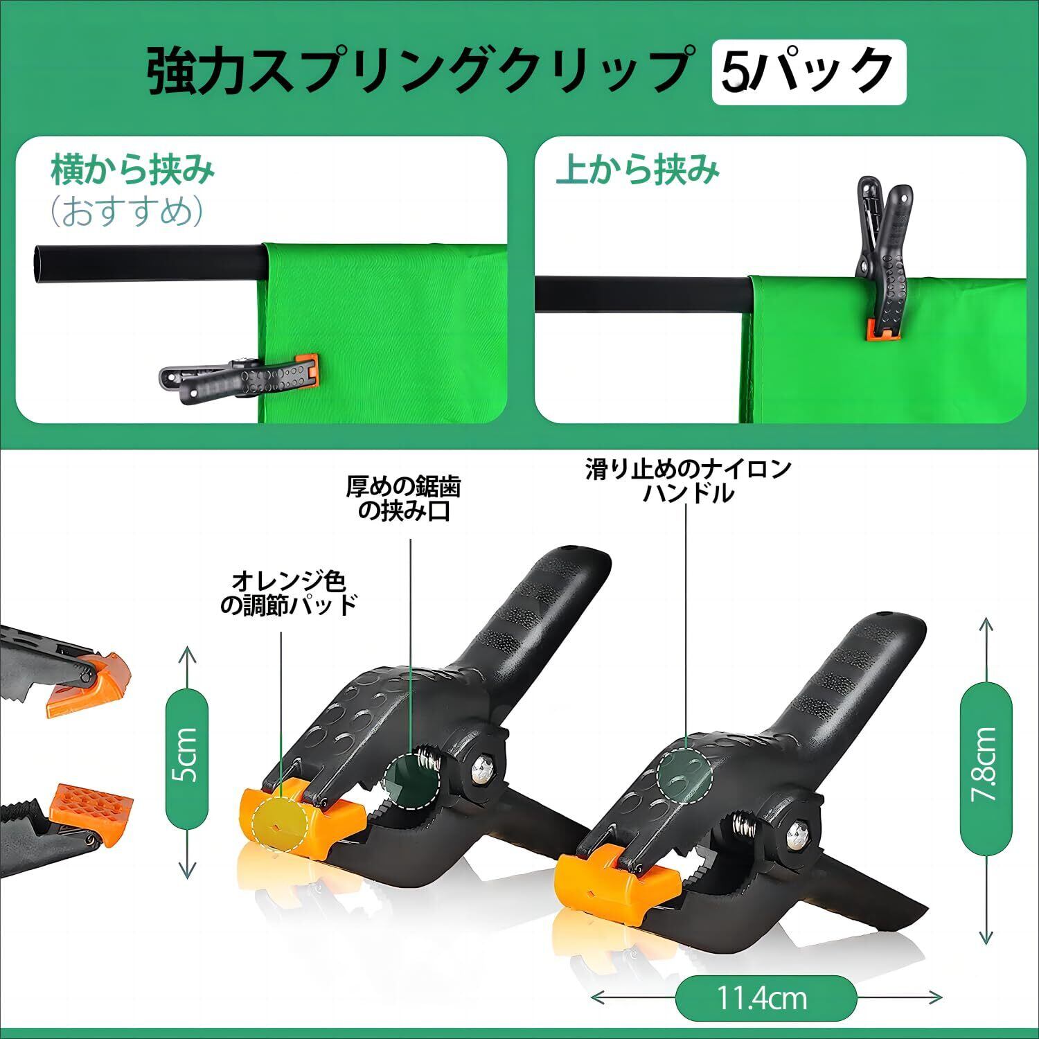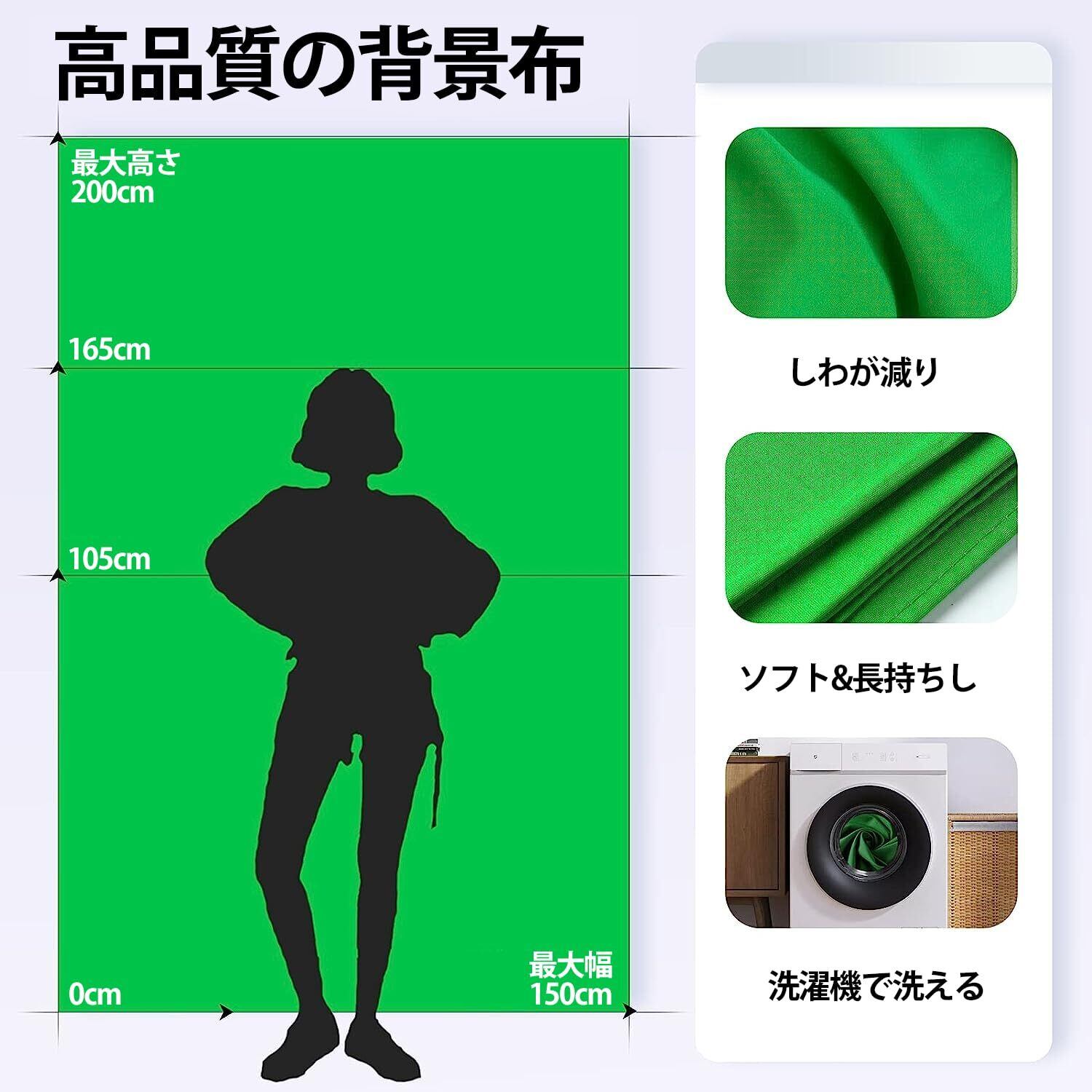 【豊かなアクセサリ付き】❶グリーンバック150ⅹ200cm(重厚感があり、肌触りも柔らかく、色も鮮やかです。製作原理の違いで強度が高く、耐久性も優れている。余計な光の反射を防ぎ、光沢感を抑えて、撮影対象を自然に引き立てできます。) ❷5個のスプリングクランプ(背景布、背景紙、暗幕やクロマキースクリーンなどしっかりと背景布スタンドに固定され、脱落することが絶対に起こらりません。)❸1個のナイロン製のサンドバック(高い場合や吊り下げられた物体が重い場合にも不安定になる可能性がありますが、付属のサンドバックを使用すると、底部の重量が増加し、背景スタンドの安定性が向上します。)➍キャリーバッグ(プレミアム品質のナイロン素材で、持ち運びやコンパクト収納に便利なバッグです。)