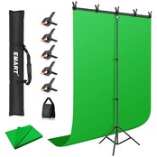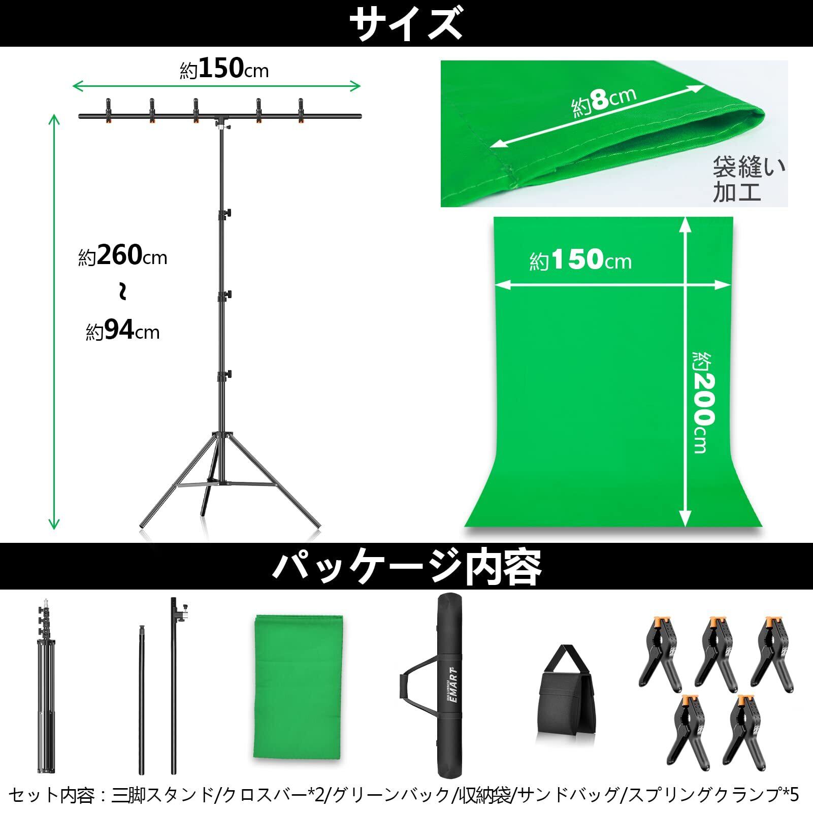 EMART 背景スタンド T字背景スタンド150X260cm 撮影スタンド 幅、高さ調節可能 背景スタンドセット グリーンバック150x200cm 生放送、web会議、ビデオ通信、動画などに適用 背景布 背景クロマキー合成、テレワーク、オンライン授業、オンライン飲み会など幅広く応用 三脚ケース付き