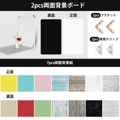 【パッケージ内容】両面背景ボードx2、両面背景紙x7、ブラケットx2、専用クリップx2。背景ボードのサイズ:40cmx30cm、1PCSの背景ボードの重さ:0.375kg、背景ボードの厚さ:5mm。背景紙のサイズ:40cmx29.5cm、1PCSの背景紙の重さ:250g。同じ価格で他の人より多くのパターンを手に入れることができ、すべての撮影ニーズを満たすことができます。