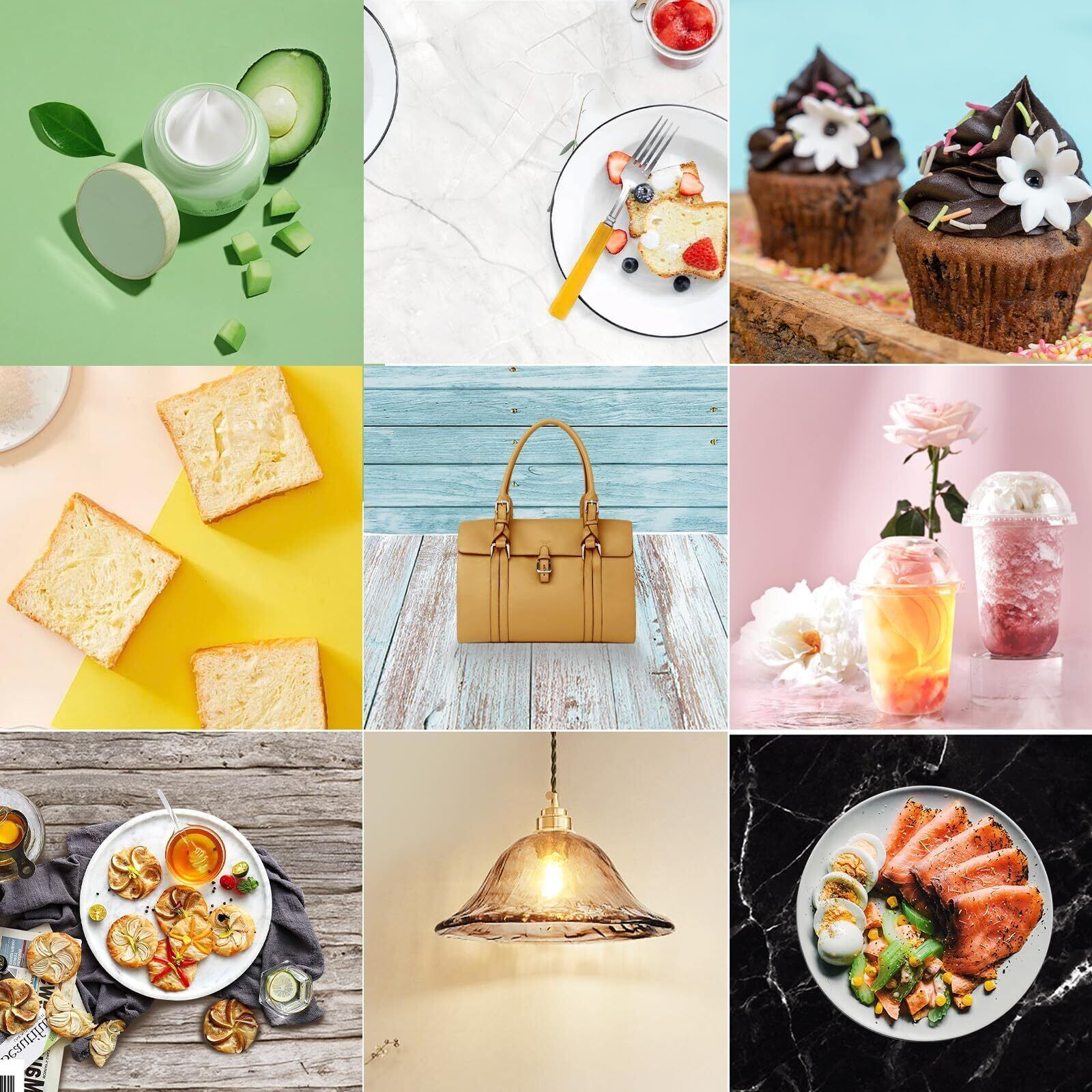 【新しいタイプの撮影背景】高品質なボール紙素材で、シワ、反射、防水防塵、色差がない、3Dハイビジョン印刷よりリアルです。クリエイティブでスタイリッシュな撮影背景で、2PCSの背景ボードと7PCSの背景紙で16種類のパターンがあり、高品質な印刷技術を施し、大理石柄、木目柄、レンガ調などの背景はより良い撮影効果を取れます。1枚の背景紙に様々な雰囲気を実現でき、お気に入りのカラーパレットのテーマをキャッチします。