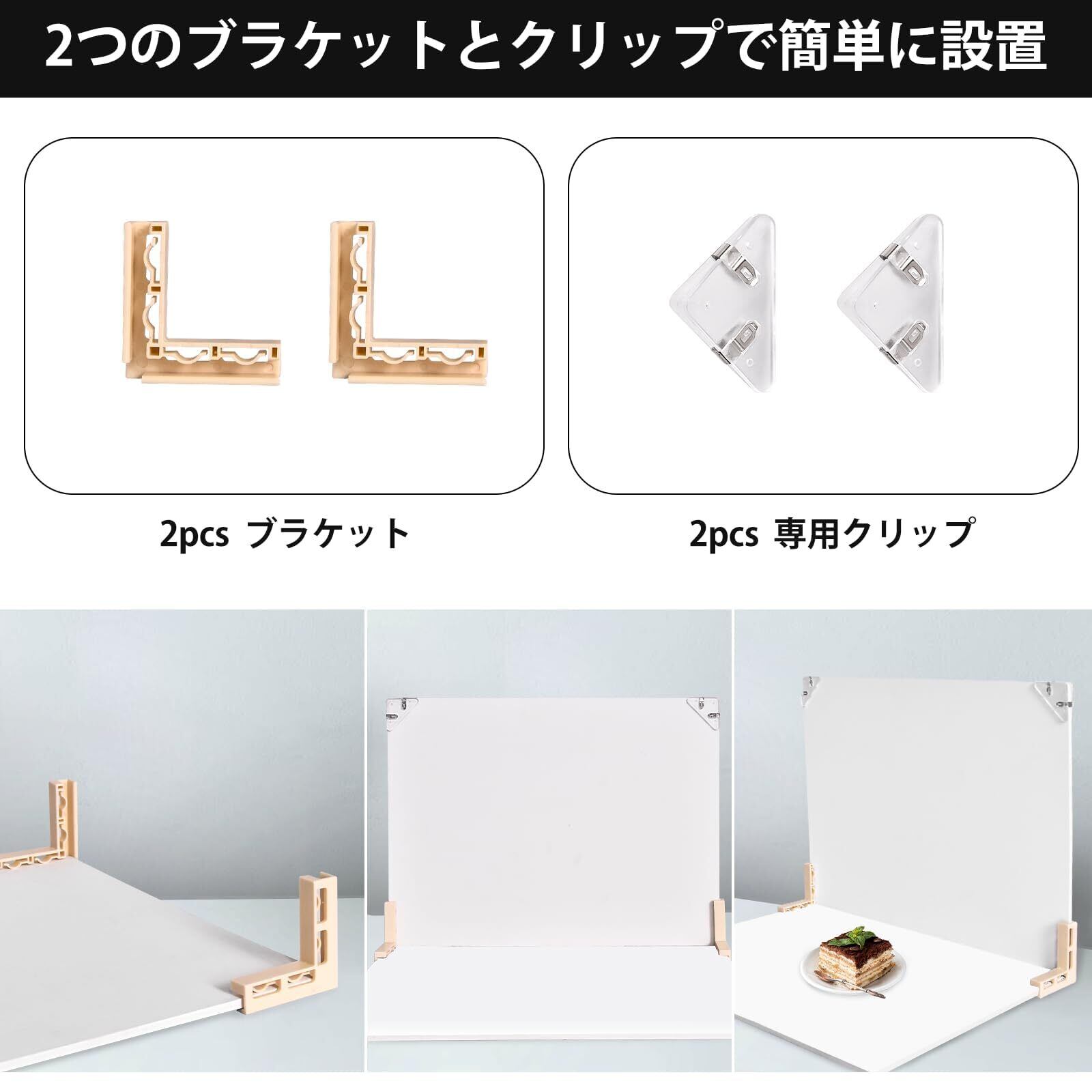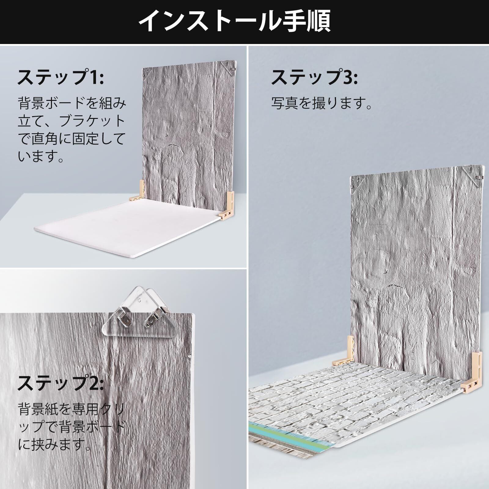 【組み立て簡単】すべての背景板セットには2つのブラケットが付属しています。2PCSの背景ボードをブラケットで直角に固定し、この垂直の背景は背景の壁として最適です。また専用クリップ2つ付きますので、背景紙を快速に組み立てて利用することができます。2つの異なるスタイルを組み合わせたり、別々に組み合わせたりして、必要な異なる効果を実現できます。