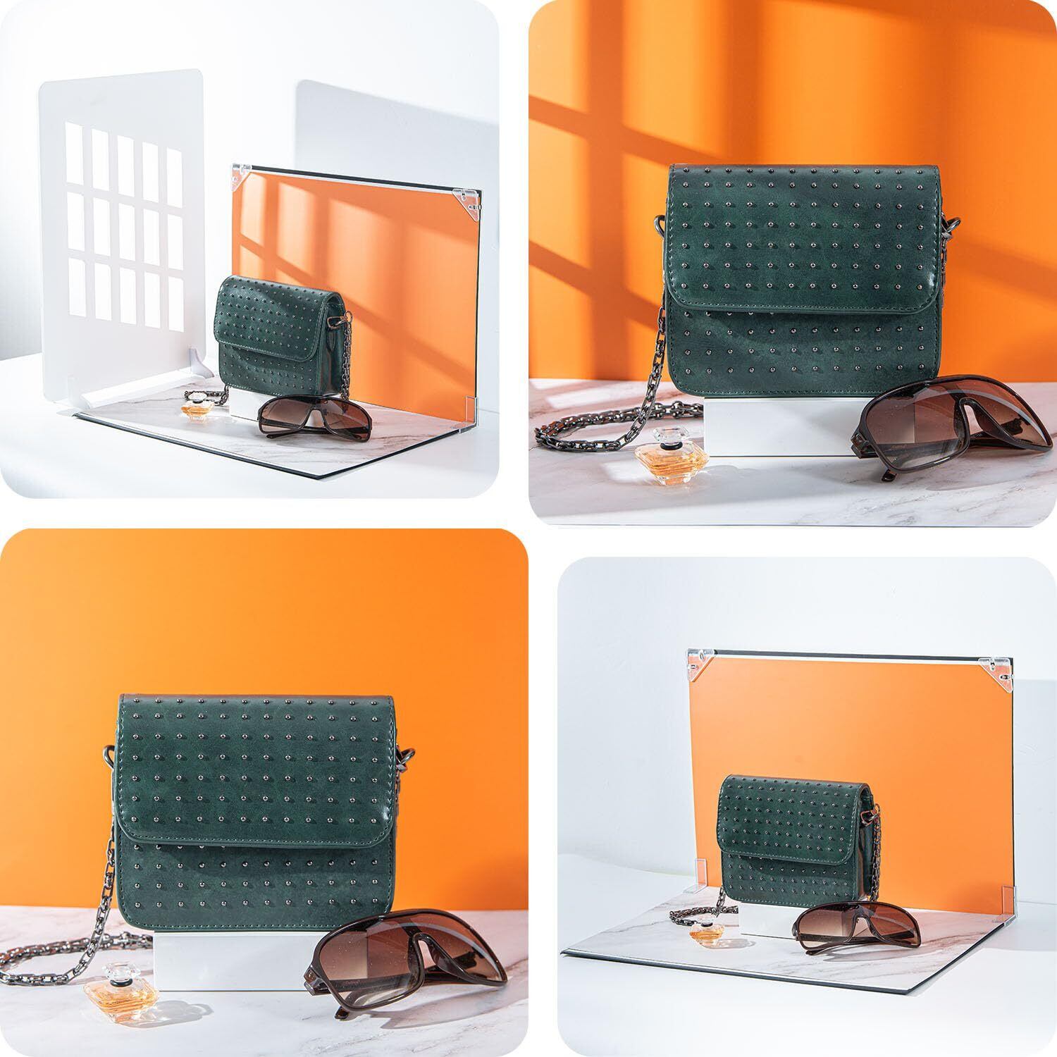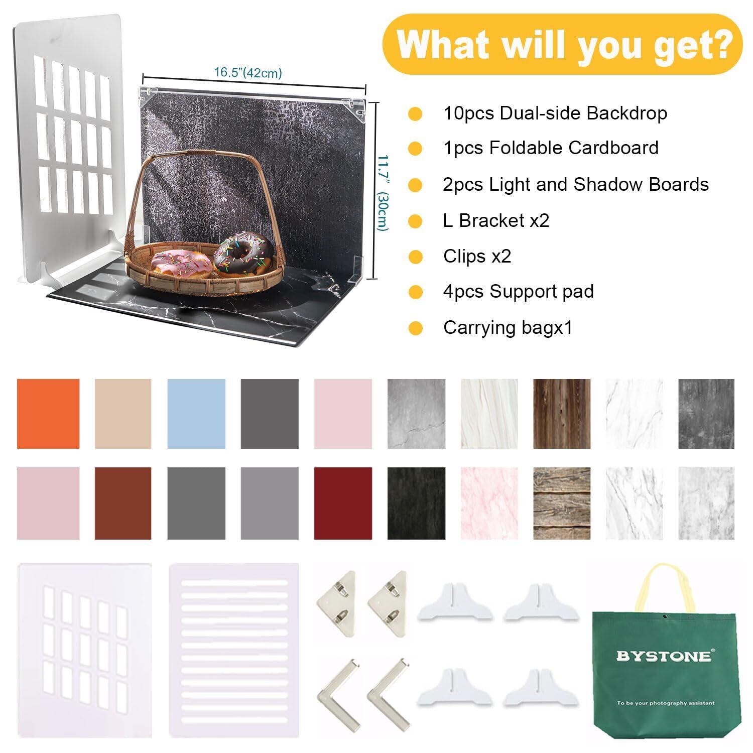 【スモールサイズ】:16×11.7インチの背景ボード。シャドウ小道具2個(厚みのある高密度ポリ塩化ビニル拡張シート)とHD背景紙10枚。 コンパクトなサイズのセットアップで、スタジオや旅行で簡単に使用できます。 卓上写真、平面撮影、正面撮影に最適なツールです。