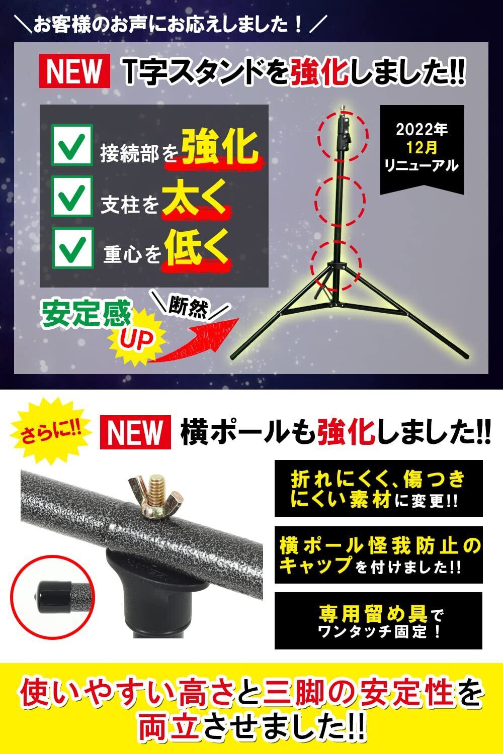 【T型スタンド】「強度×軽さ×サイズ」 を追求!女性子供でも簡単に持ち運べ、設置できる簡易組み立てにこだわりました!また,収納も付属の収納袋でコンパクトに保管できます。サイズは、最大高さ約190cm×幅155cmでご使用いただけます。 テレワーク リモートワーク だけでの 背景布 使用、または 背景布 利用初心者の方にはベストサイズです。 【2タイプのクリップ付属】 背景布 によく使用される黒い万能クリップは開きがとても硬い!というお声を多く聞きました。なので・・・柔らかいのに留め強度が強い「目玉クリップ」を3個追加で付属しました。 .