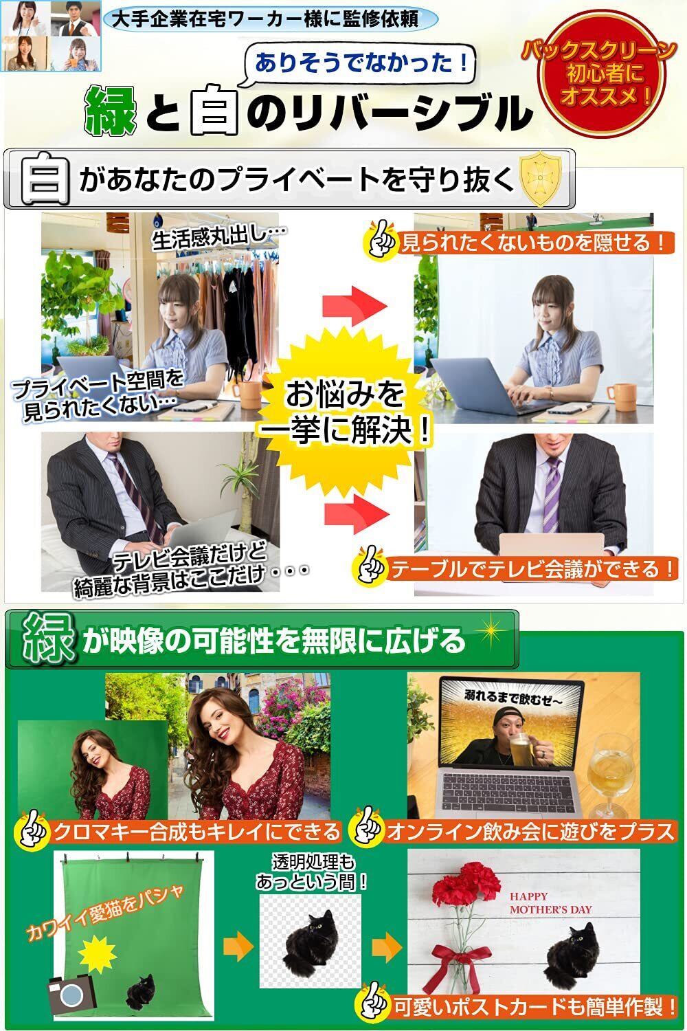 【 市場初!緑白リバーシブル 背景布 】有りそうで無かった 緑と白のリバーシブル(両面) 背景布 が、あなたのプライベートを守り抜き、また リモートワーク テレワーク の可能性を広げるお手伝いをいたします! 【 白 】 急に決まった web会議 、部屋の汚れが・・・お掃除せずに 白面背景を利用してください! 【 緑 】定番化してきたオンライン飲み会、何か面白い事できないかな・・・バーチャル背景にご利用ください! 【?なぜ緑?】緑は人肌と反対色(補色関係)のため合成加工が綺麗にできます。 .