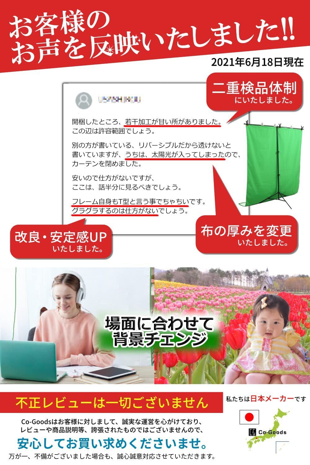 【 23年1月スタンド強化しました 】【普通の 背景布 グリーンバック は「透けて使いにくい」「端がめくれてしまい使えなくなる」ものが多数です。ご注意ください】 【 大手企業 在宅ワーカー 様に監修依頼】 テレワーク ・ リモートワーク に本当に必要な 「 背景布 (緑白 リバーシブル)(透けにくい) 」「 T型スタンド 」「 留めクリップ 」フルセット を、頻繁にご活用されている 在宅ワーカー 様の監修のもと製造メーカーCo-Goodsが形にしました! 【 zoom ズーム skype youtube LINE 等 リモート 会議 や オンライン飲み会 動画配信 に是非ご利用ください!】 【 競合他社の妨害について 】 現在、同業者の営業妨害によりレビュー操作をされる被害を受けており、調査機関に依頼をかけ、犯人の特定を行なっております。 .