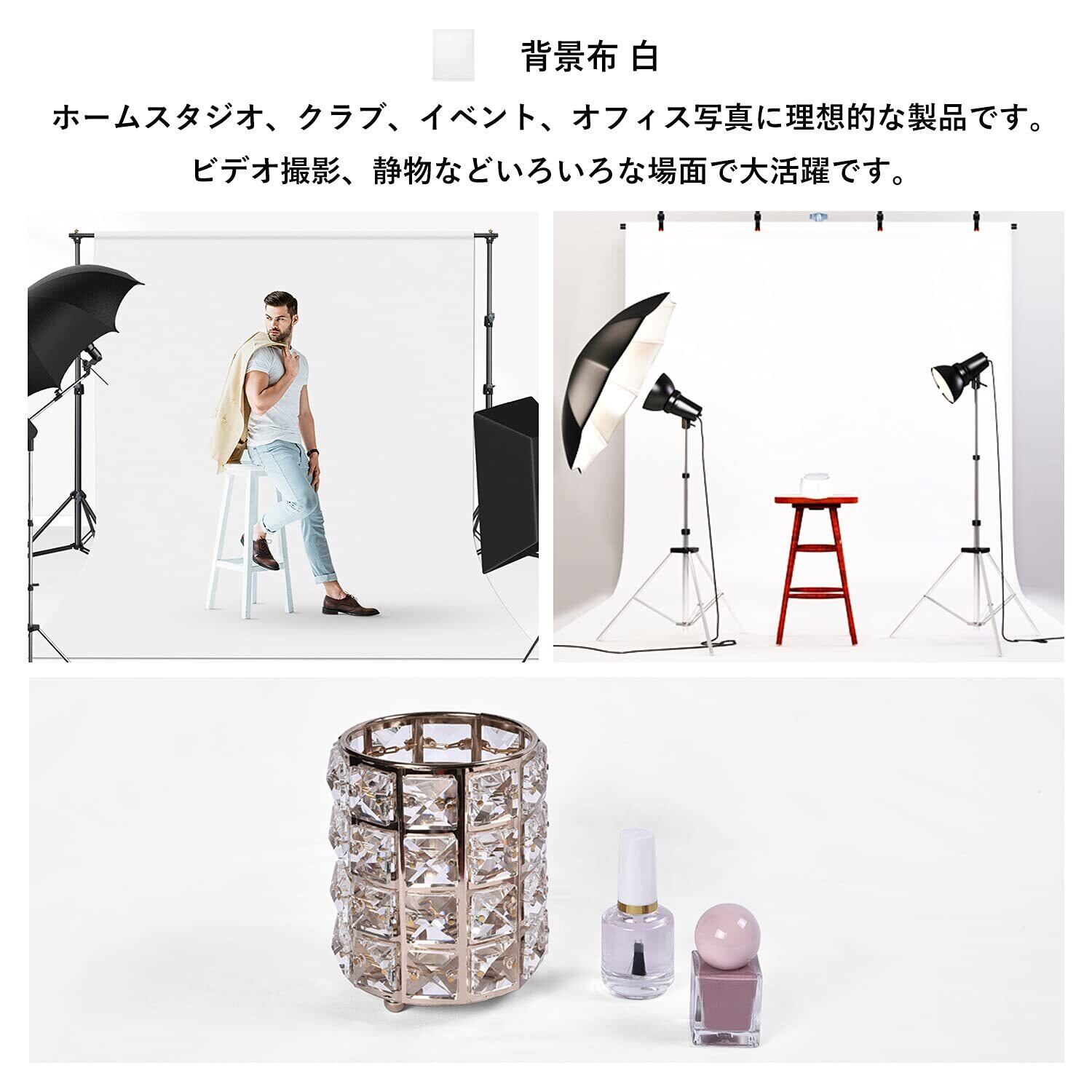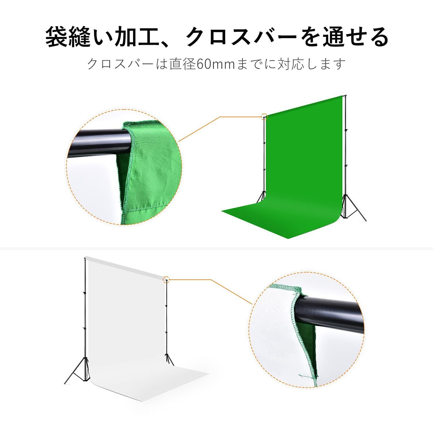 【こだわった縫製・長くご愛用頂け】背景布の端はよく処理されて、糸抜けやすくないです。こだわった縫製、全面白または全面緑、エンジに別の色が混じなくて専門な撮影スタジオにも適用します。背景布はポリエステル材質を採用し、綿よりシワが目立たなく、垂れ感がよくて、素晴らしいスタジオの効果を提供できます。