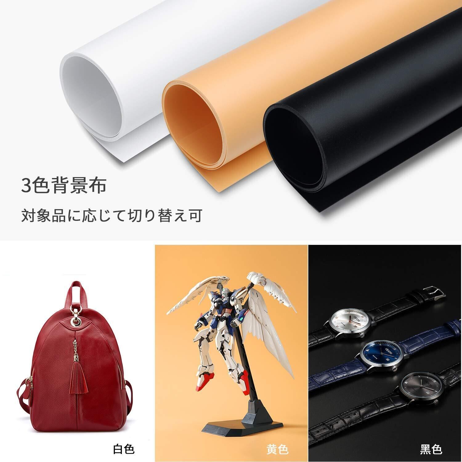 ■【多彩な背景でシーンに合わせて演出!】付属の3枚のPVC背景布(黒、白、緑)と1枚の柔光布により、さまざまなシーンやスタイルに応じた撮影が可能です。簡単に取り替えられるため、創造力を存分に発揮できます。