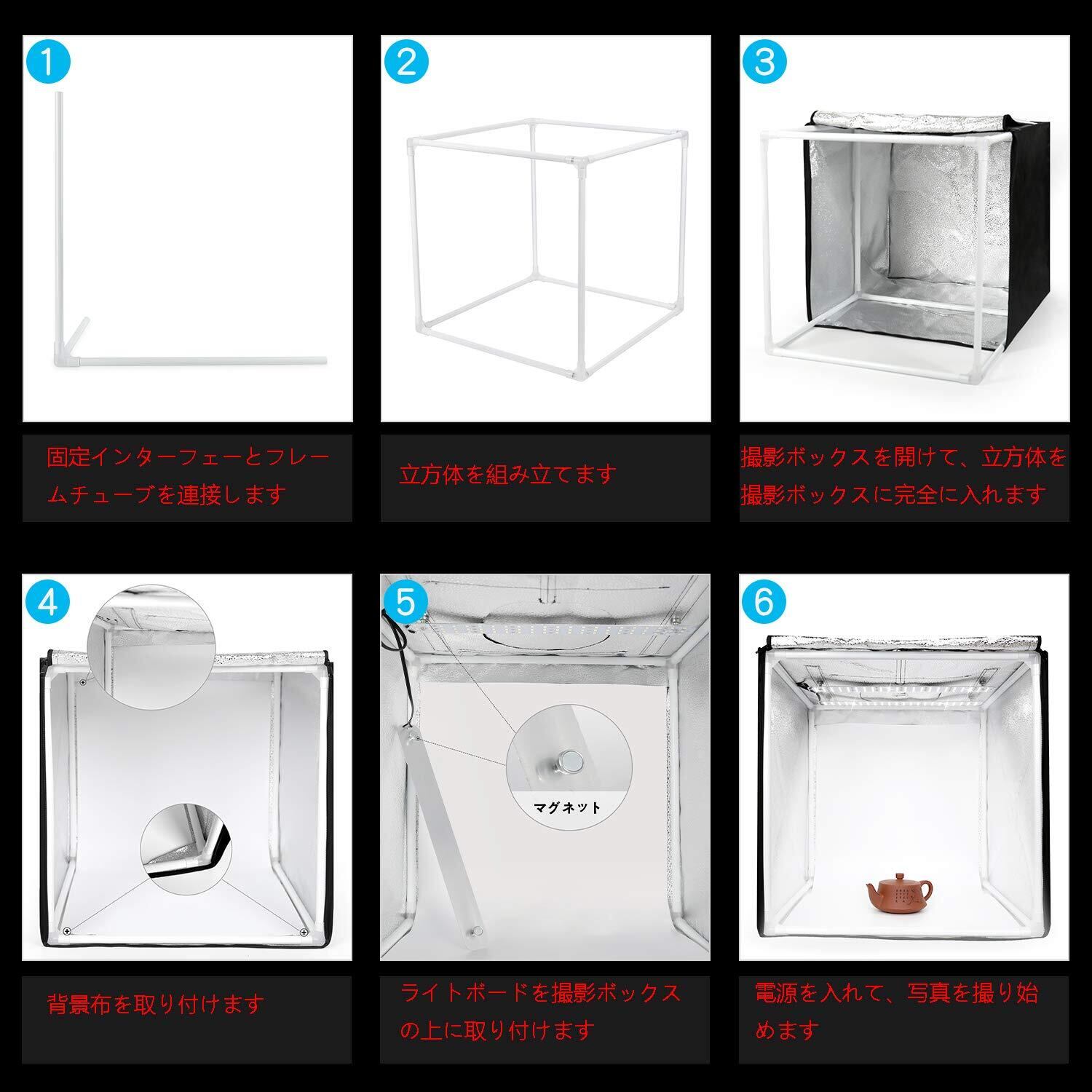 【多角度撮影可能】正面撮影だけではなく、上に穴がありますので、上部からも撮影できます、多角度から綺麗に撮影できます。違う撮影需要を満足できます。【簡単な組み立て】撮影ボックスのブラケットはチューブから組み立てられるので、組み立てや分解にも非常に便利です。撮影ボックスの外部はジッパーにつなかている、取り付けと拆除には素手だでできます。
