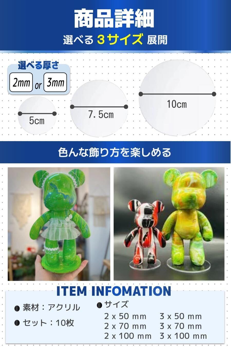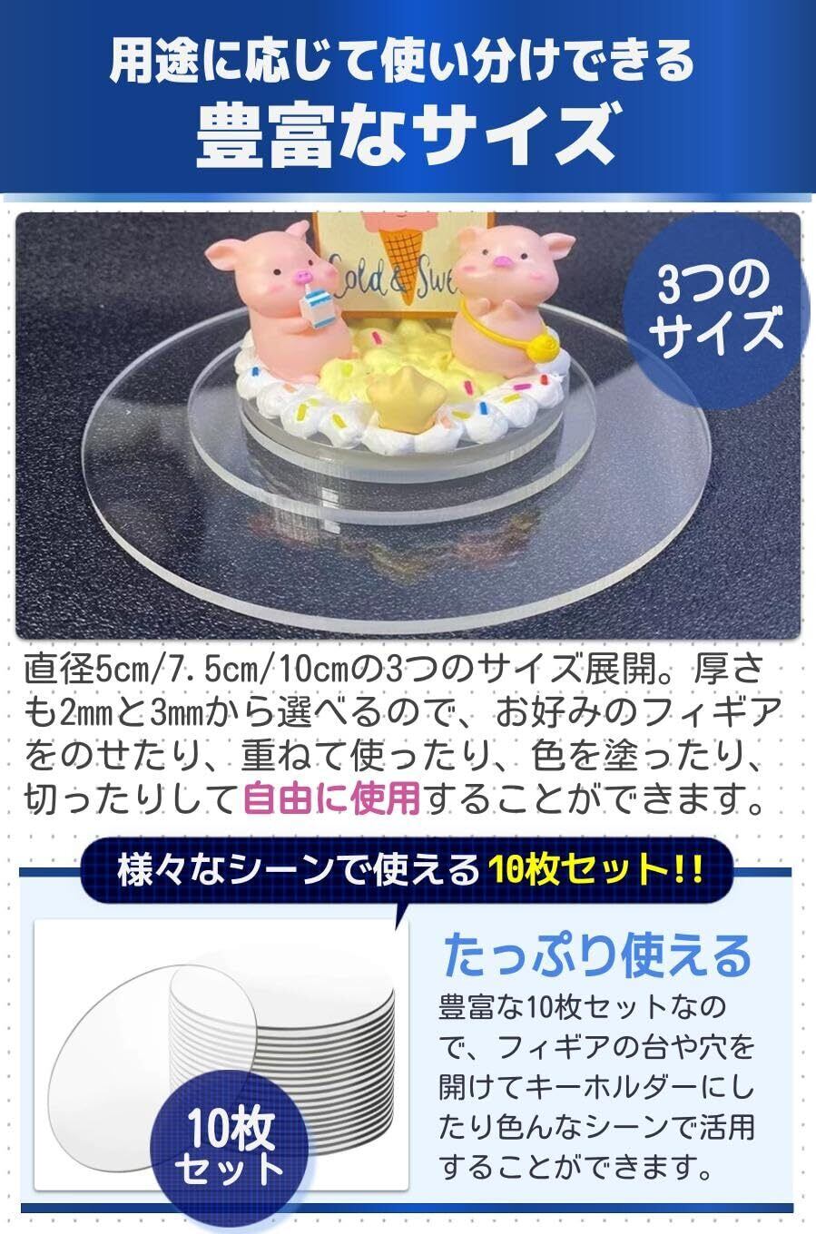 【豊富なサイズ】直径5cm/7.5cm/10cmの3つのサイズ展開。厚さも2mmと3mmから選べるので、お好みのフィギアをのせたり、重ねて使ったり、色を塗ったり、切ったりして自由に使用することができます。