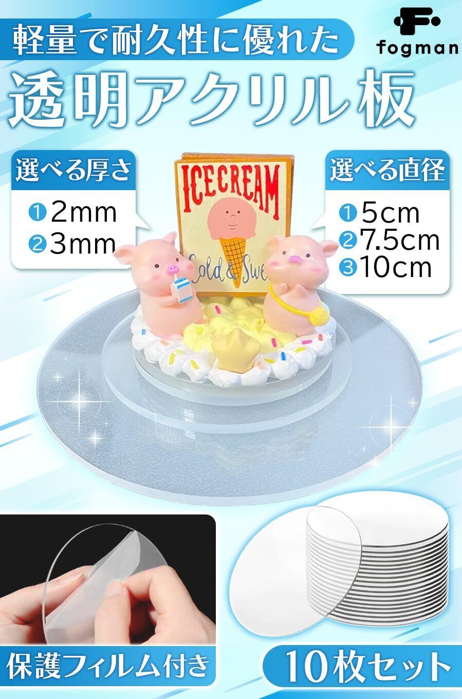 【特別価格】fogman アクリル板 円形 丸 プレート 高透明度 クリア 保護フィルム付き 10枚セット (2mm厚, 直径5cm)