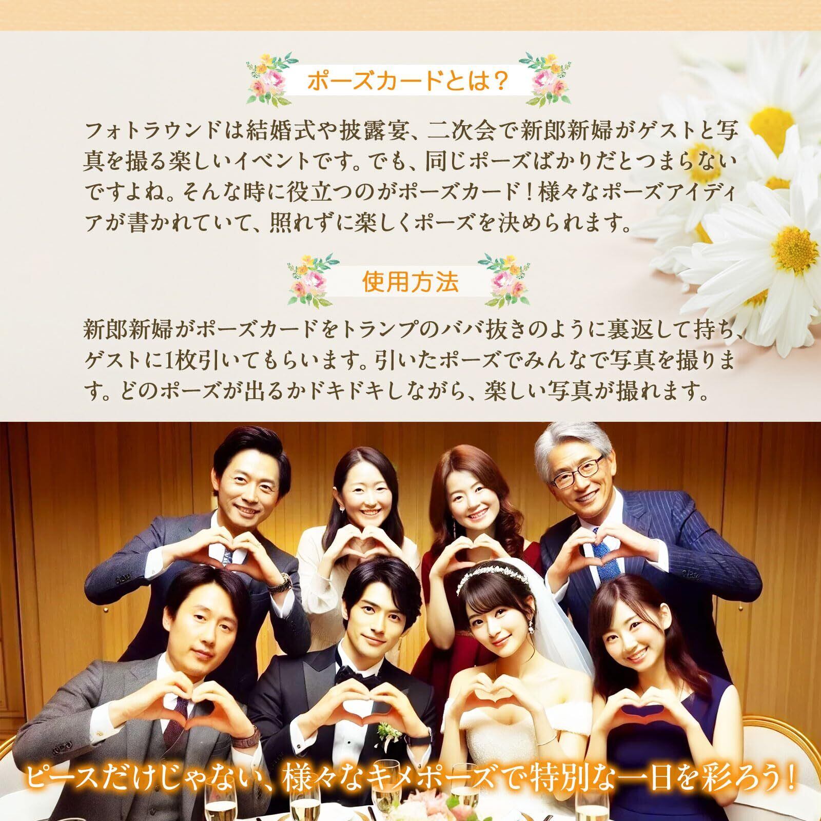 【ポーズカードとは】新郎新婦とゲストのフォトラウンドを盛り上げるアイテムです。ワンパターンになりがちな写真撮影に、多彩なポーズを提案します。ポーズカードで楽しい思い出写真を撮りましょう!